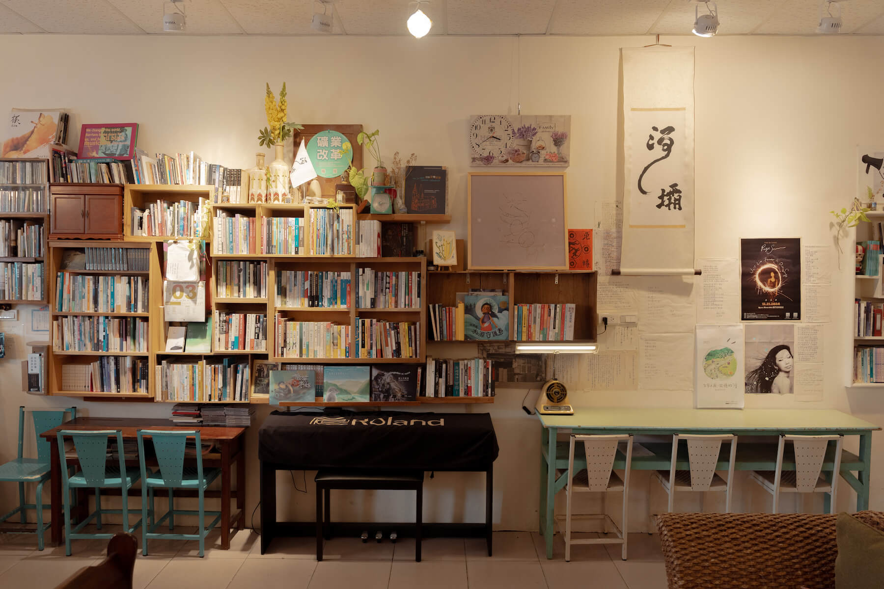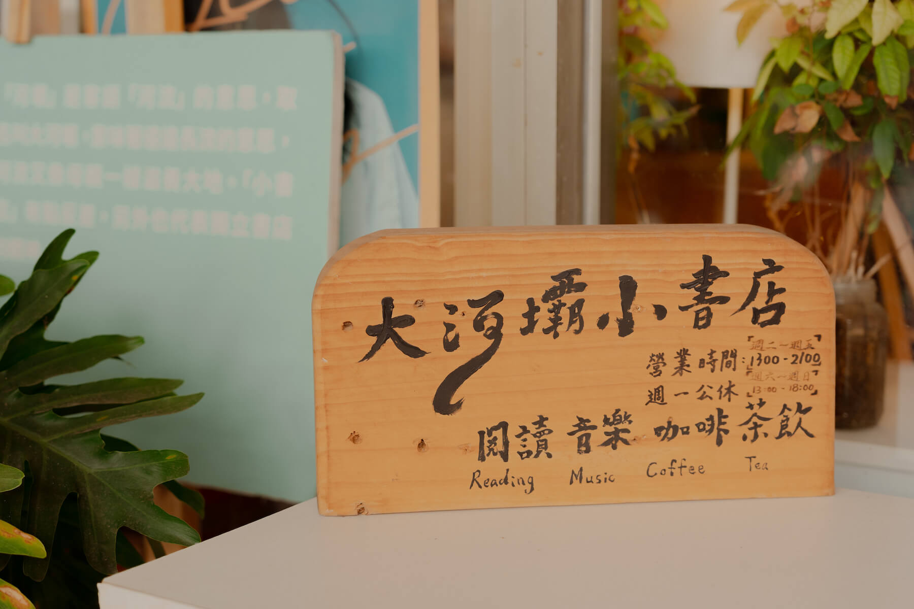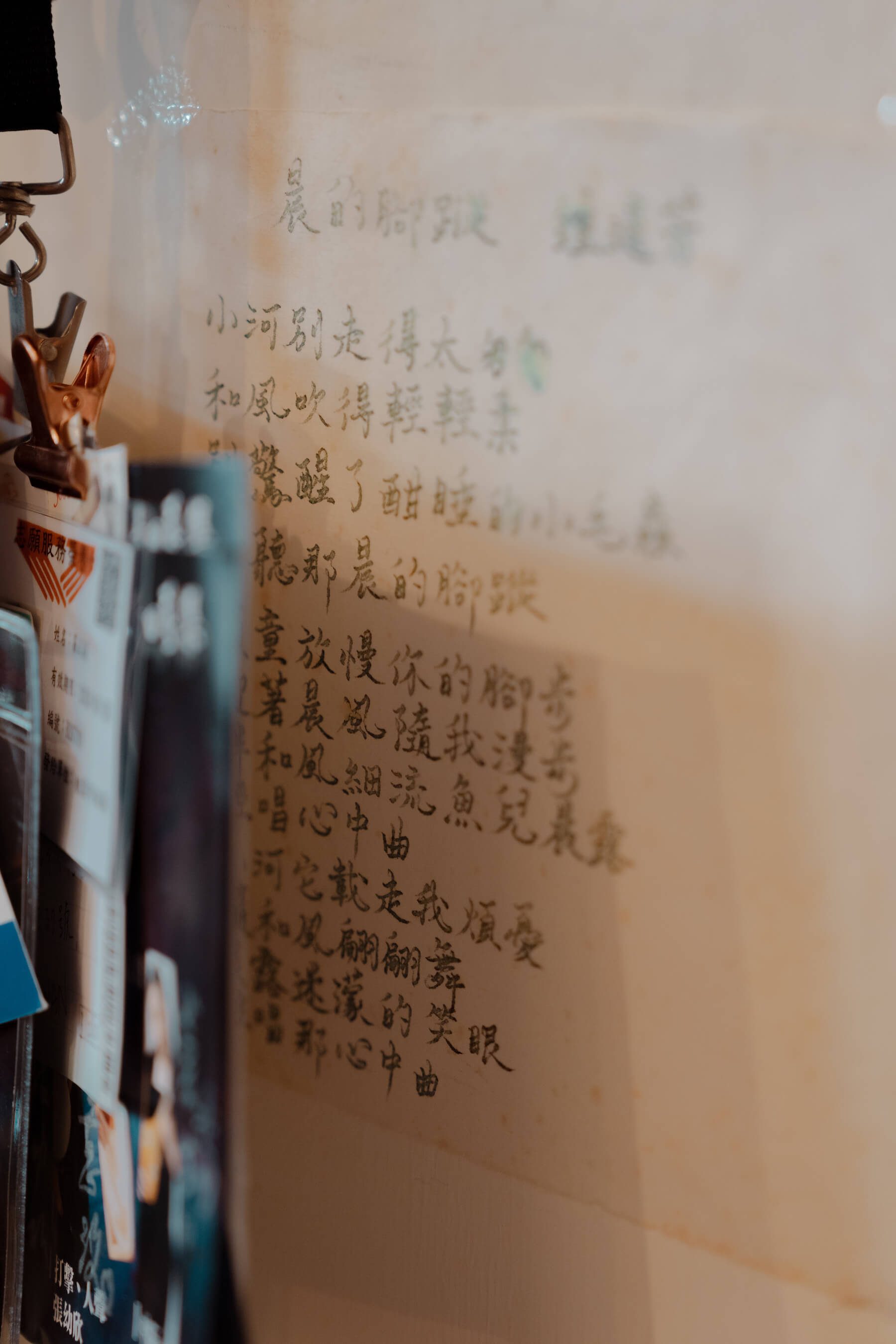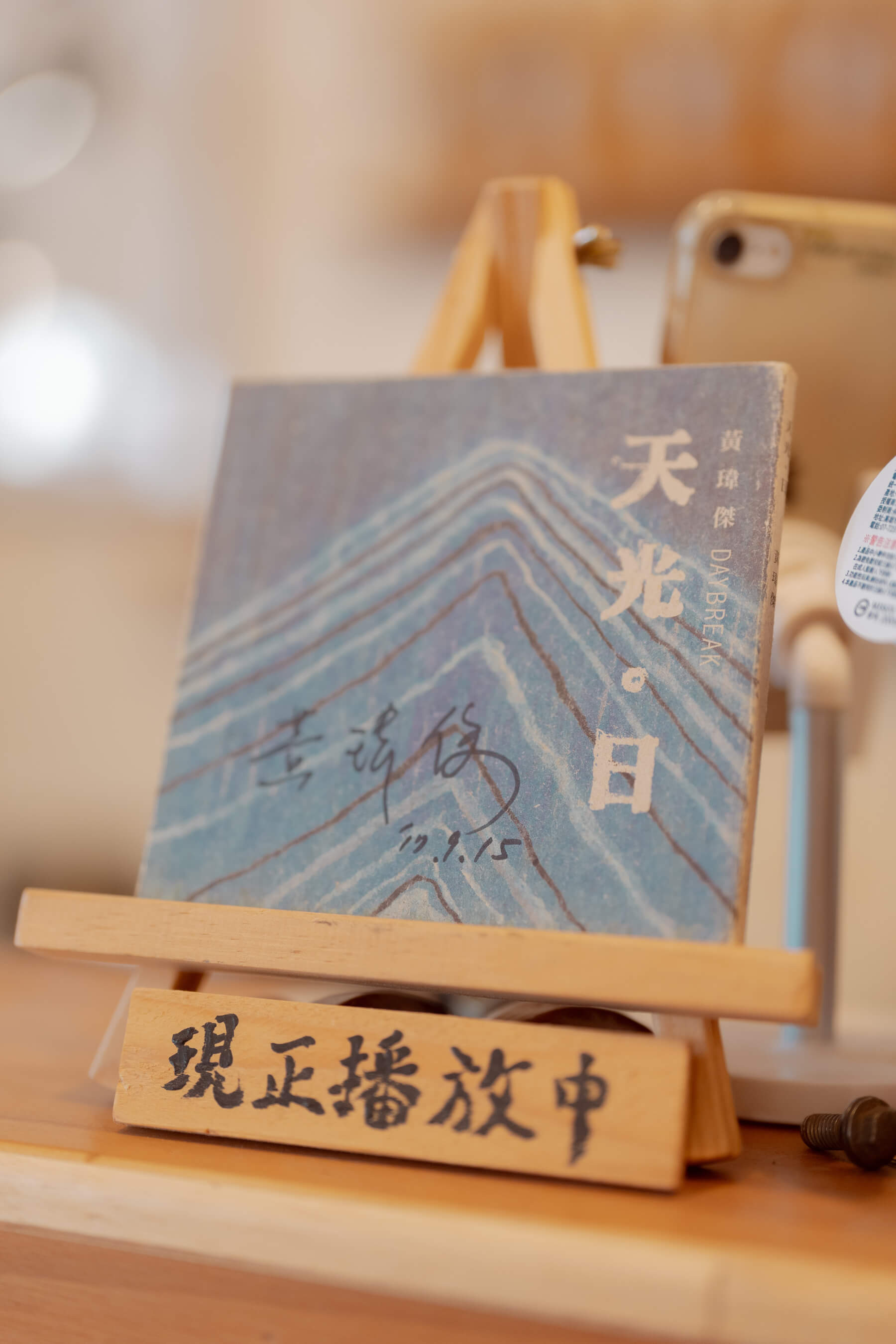*旅人筆記:書店從招牌到店內空間,隨處可見老闆的字跡,熱愛寫字的他時常提筆寫下詩句、歌詞,以筆墨裝飾書店。櫃檯旁總會擺著正在播放的專輯,從爵士到民謠,都是老闆過去一路追尋音樂的足跡。