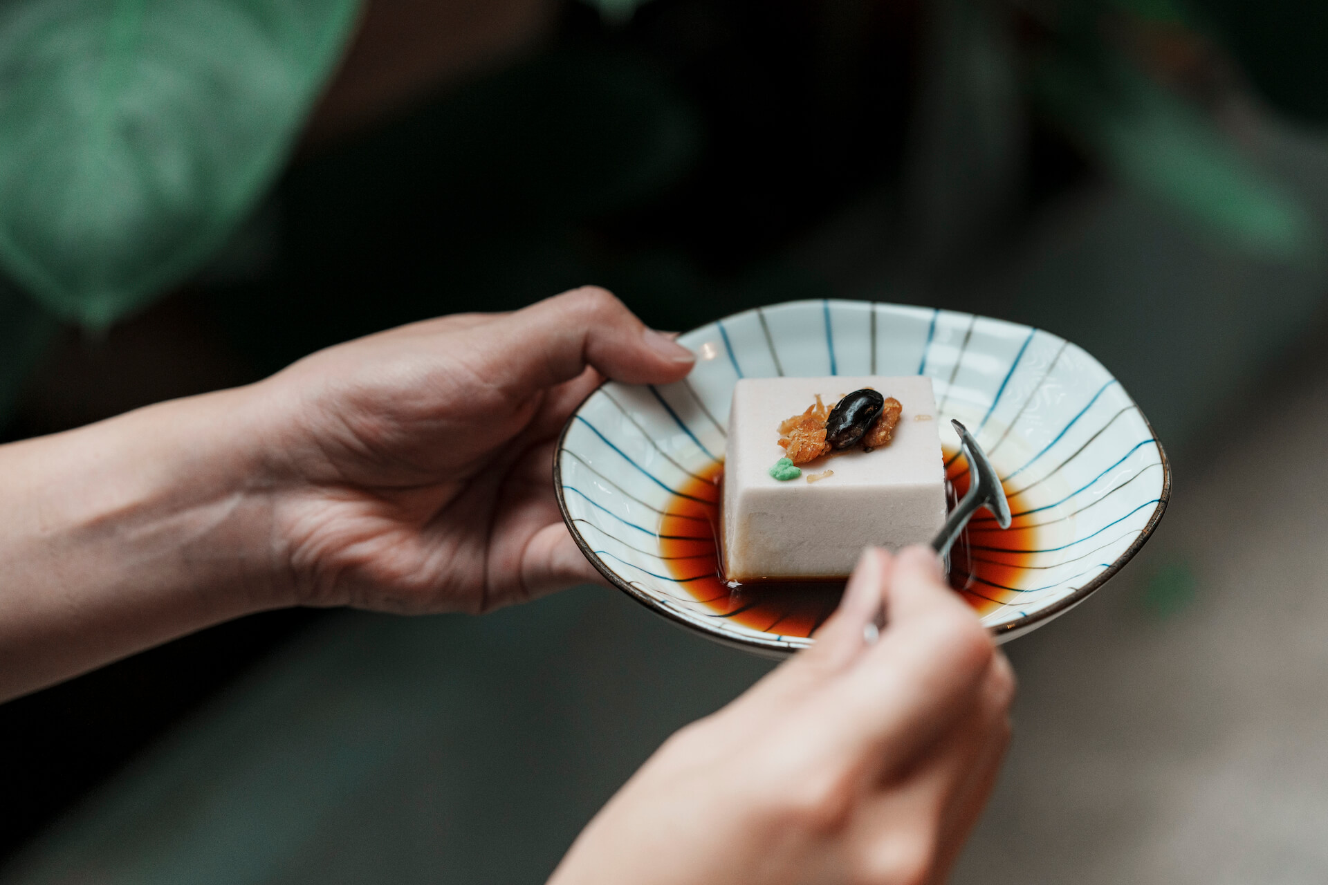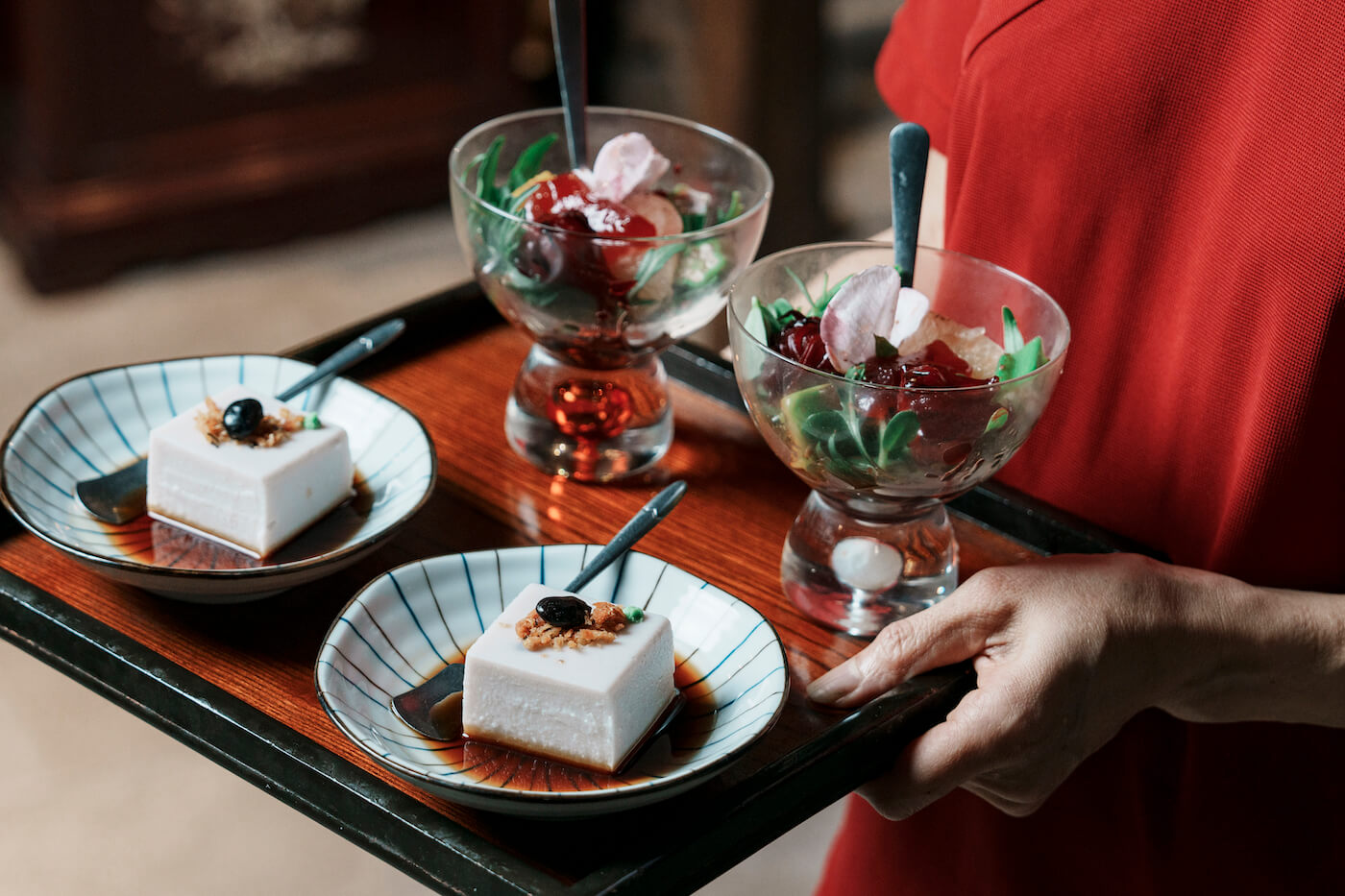 入座後,先來一杯溫熱的刺五加茶,刺五加功效媲美人蔘,能補氣提振精神,入喉甘醇溫順,尾韻是淡淡的青草香氣。前菜沙拉用精緻高腳杯承裝,自種芝麻葉佐以柚子、秋葵、酪梨等時令蔬果,淋上酸甜滋味的洛神醬汁,清爽開胃。而「米豆腐」是以米為主體製成,不同於常見以黃豆作為主要原料,米豆腐口感扎實,入口有濃濃米香,因深受客人喜愛而成為店內常設料理。