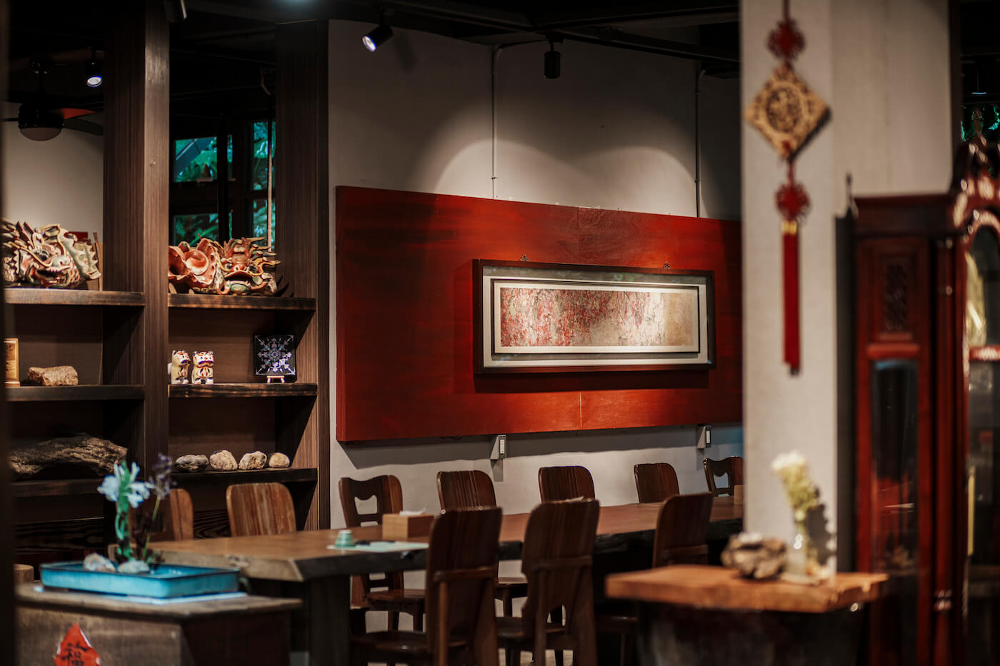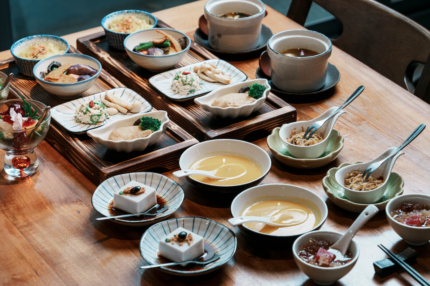 通透寬敞的空間,擺放著木製桌椅、櫥櫃與老件家具裝飾,處處充滿典雅氣息;向外延伸一條綠意廊道,那是老闆的小小植物園,舉目所及皆是能夠入菜的草藥。在這樣的空間裡,卸下都市的忙碌步調,換取心中平靜。