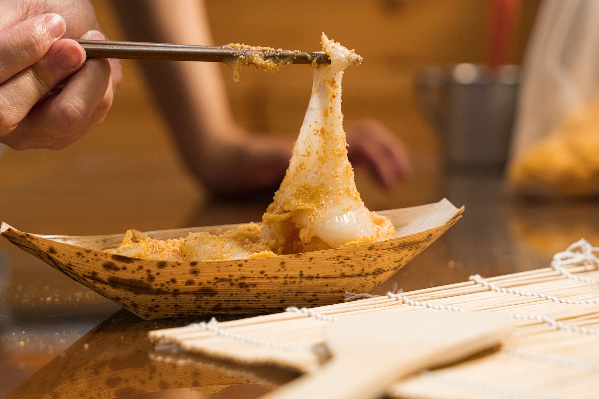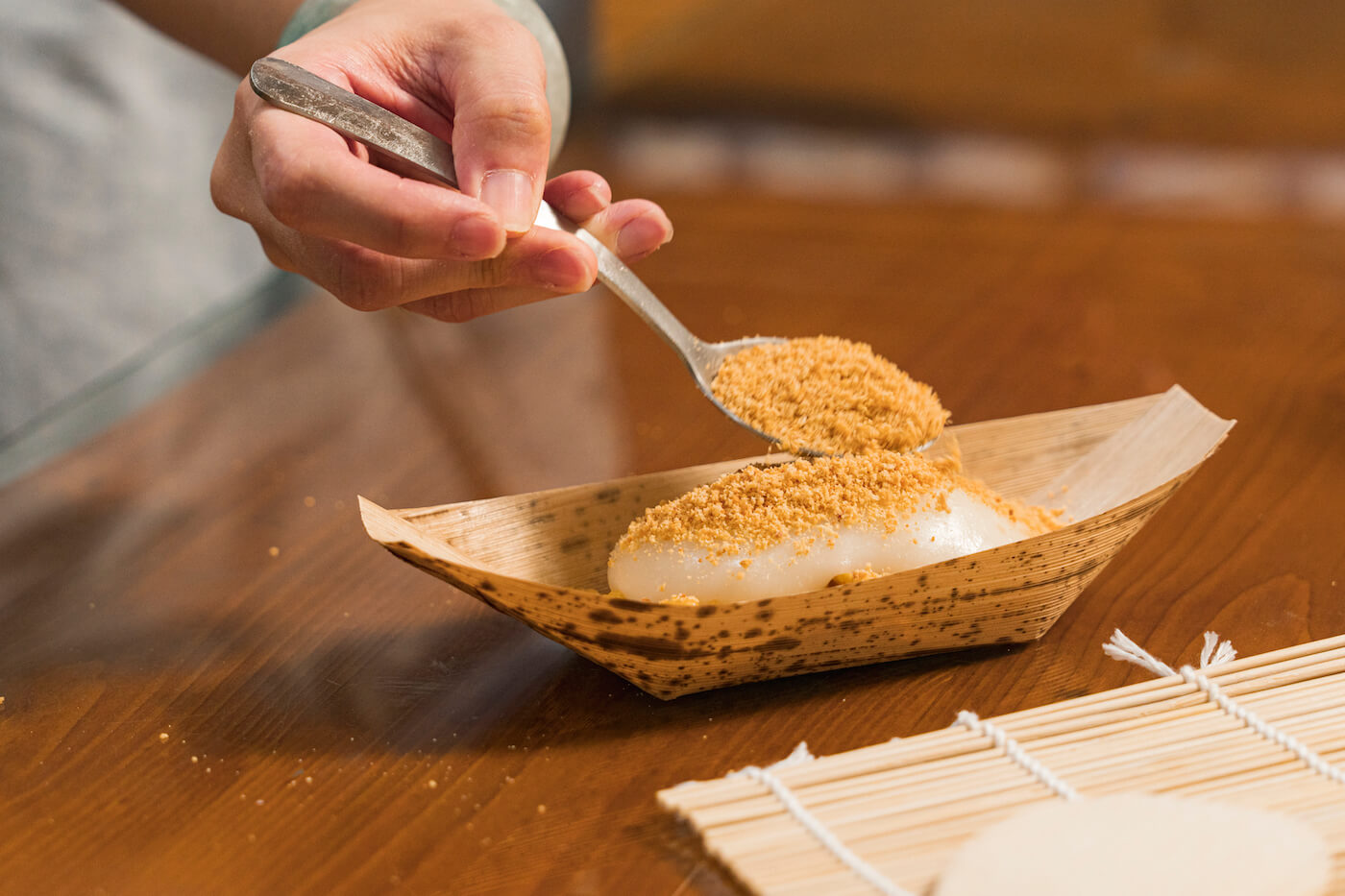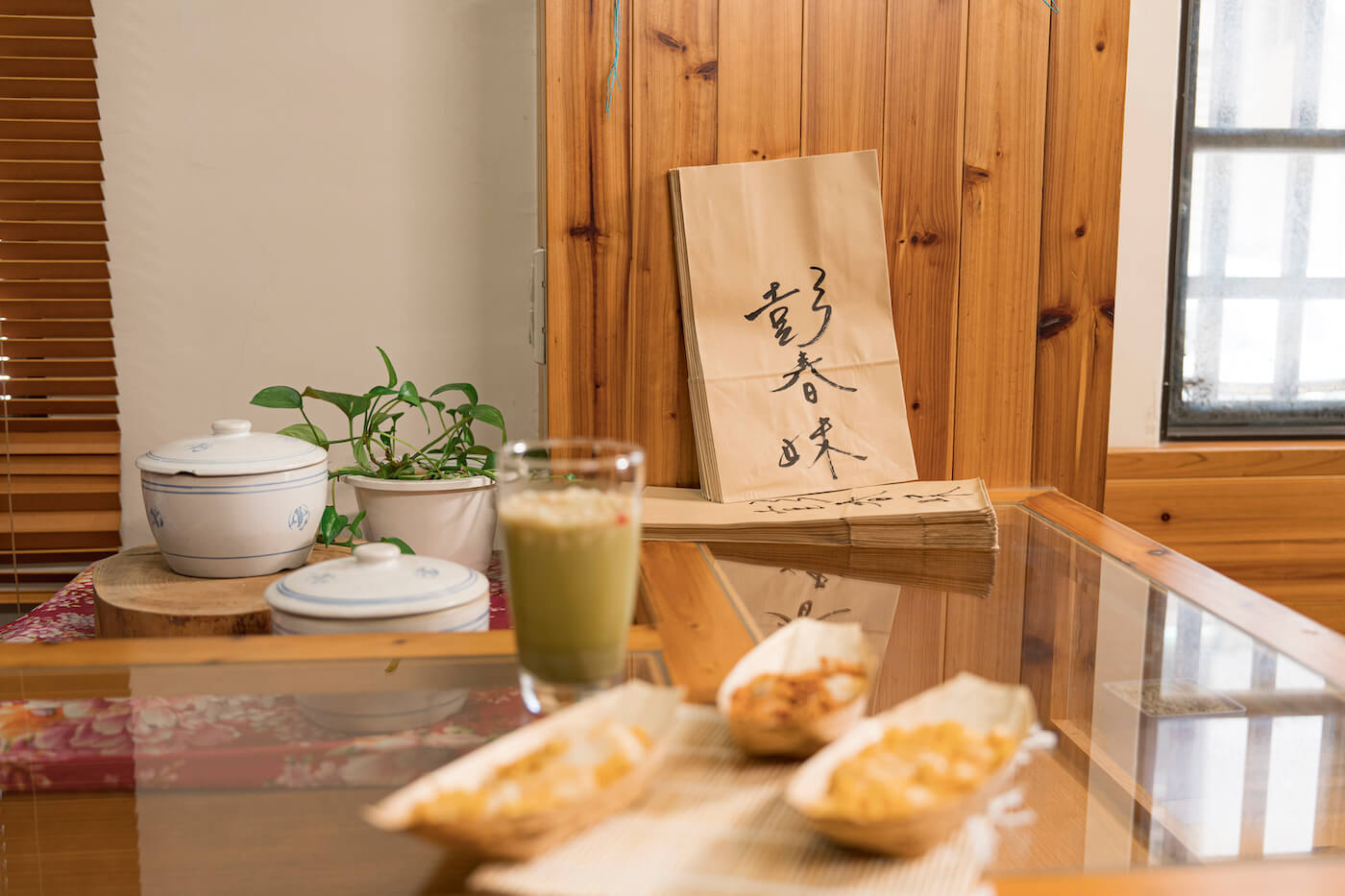 掛心客人們烈日下長時間的等待,於是兩年前在攤車不遠處租了前身為藝品店的店面,保留原本的木製櫥櫃與桌椅,顧客能在這裡搶先吃上一口熱騰騰剛出籠的麻糬,讓常民點心頓時多了一分儀式感。