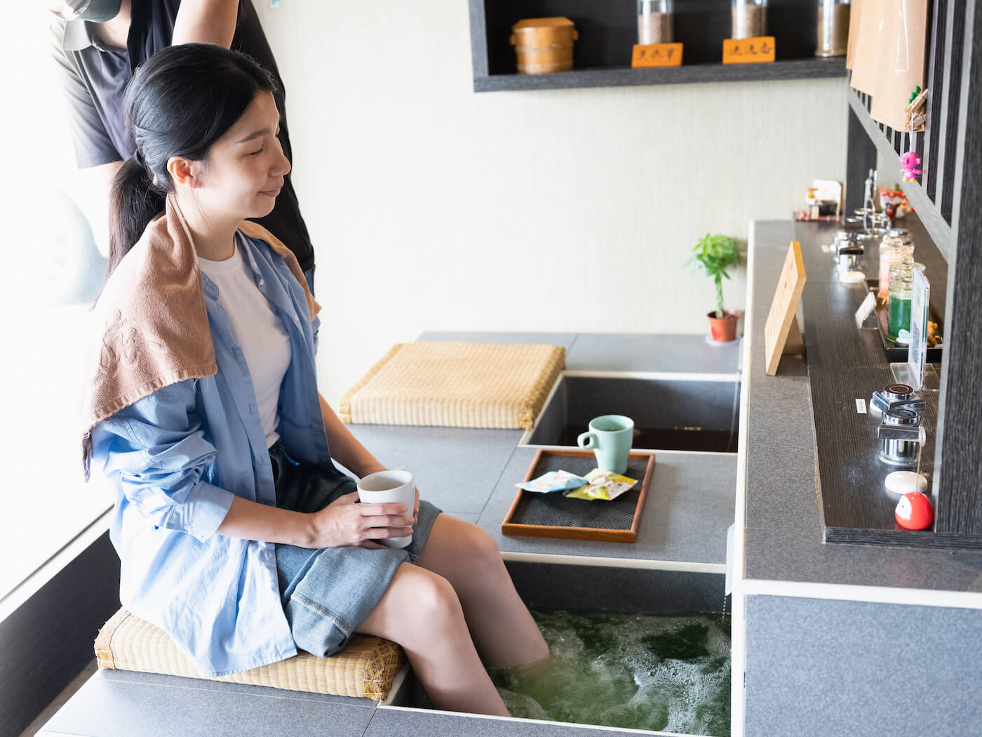 店內足浴因應不同情境加入海鹽或藥材,夏日以不同氣味的海鹽入浴,融合舒適的水溫與芬芳的氣息,緩解腳上的勞累。冬日則提供黃色、紅色、紫色三種中藥湯浴,如紫色添加薰衣草、茉莉花等藥材,適合失眠焦慮,痠痛者使用。無論是哪一種大人,都能在適合自身的足湯中獲得撫慰,回復滿滿的電力。