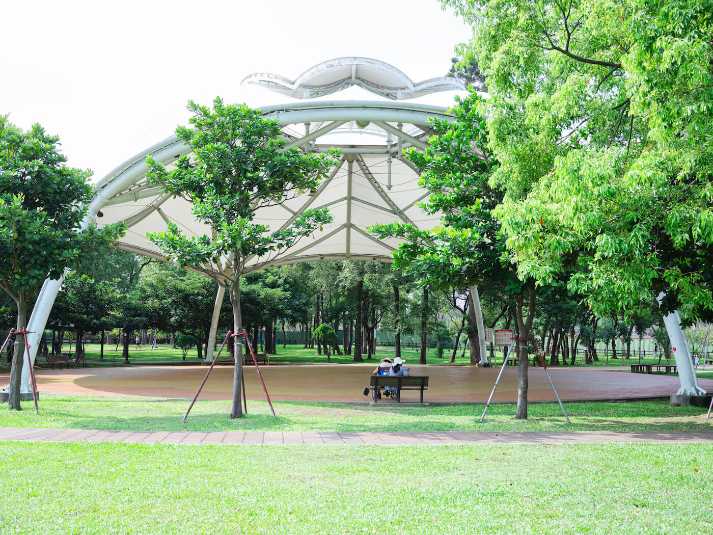 往公園中央望去,以花瓣為造型的大型天幕廣場座落其中,分做兩層,可避雨遮陽,遠遠看來就像綻放的花朵,不時看見居民在此運動,做伸展操,一幅愜意的城市即景在眼前展開。周邊還有籃球場、槌球場、兒童遊樂區、運動健身等設施,作為市民活動筋骨的場所。