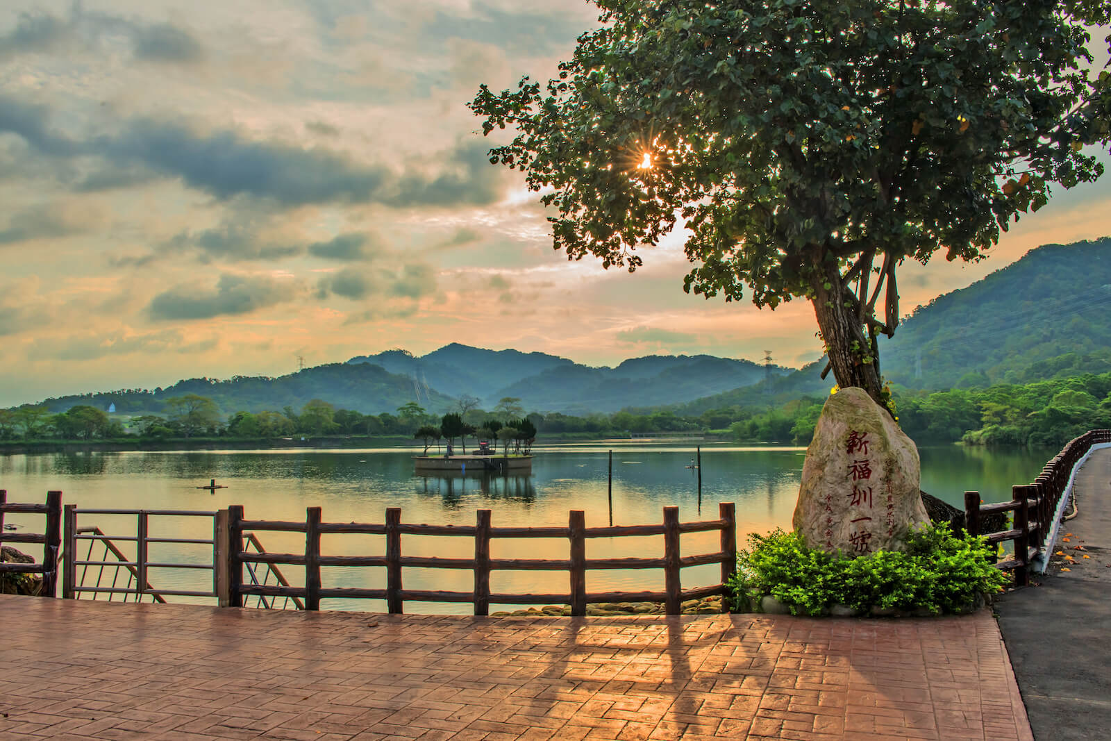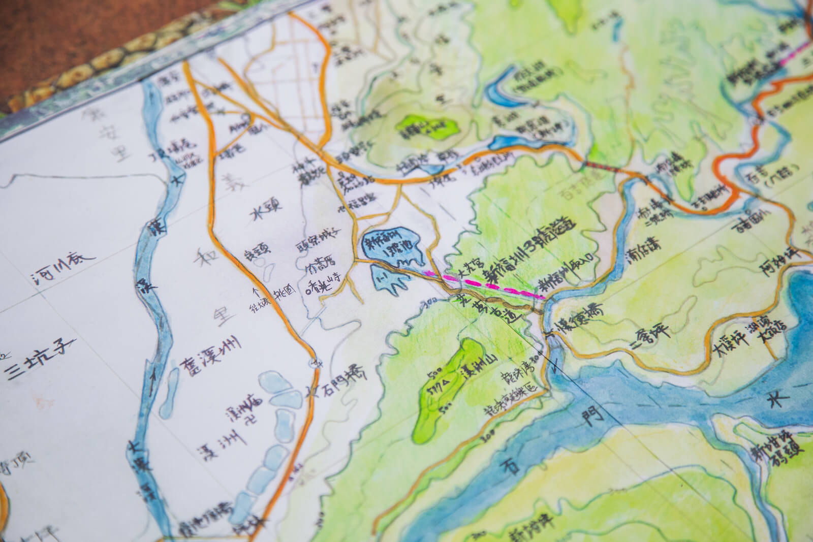 回想當年挖掘隧道的情景,陳文卿談起當時的記憶仍歷歷在目,擅長測量的他經常進入隧道,跟著工班師父一起開鑿,一次次炸藥點燃都是險象環生,現在想起還是有些害怕,所幸最後平安落成,得以灌溉三層地區270公頃農田。陳文卿接著翻開厚重手稿,拿出一幅筆觸大膽的畫作,那是由他一手繪製的畫,描繪一面被群山包圍的湖,湖心中一塊圓地有著一座小廟,陳文卿指著畫作分享當年的故事,在挖掘大池的過程中,幾次擲筊後瞭解土地公不願搬遷,於是留下這塊土地,這座土地公廟就這樣靜靜地座落在新福圳一號池中,成了一處幽靜之地,吸引不少人慕名前往。