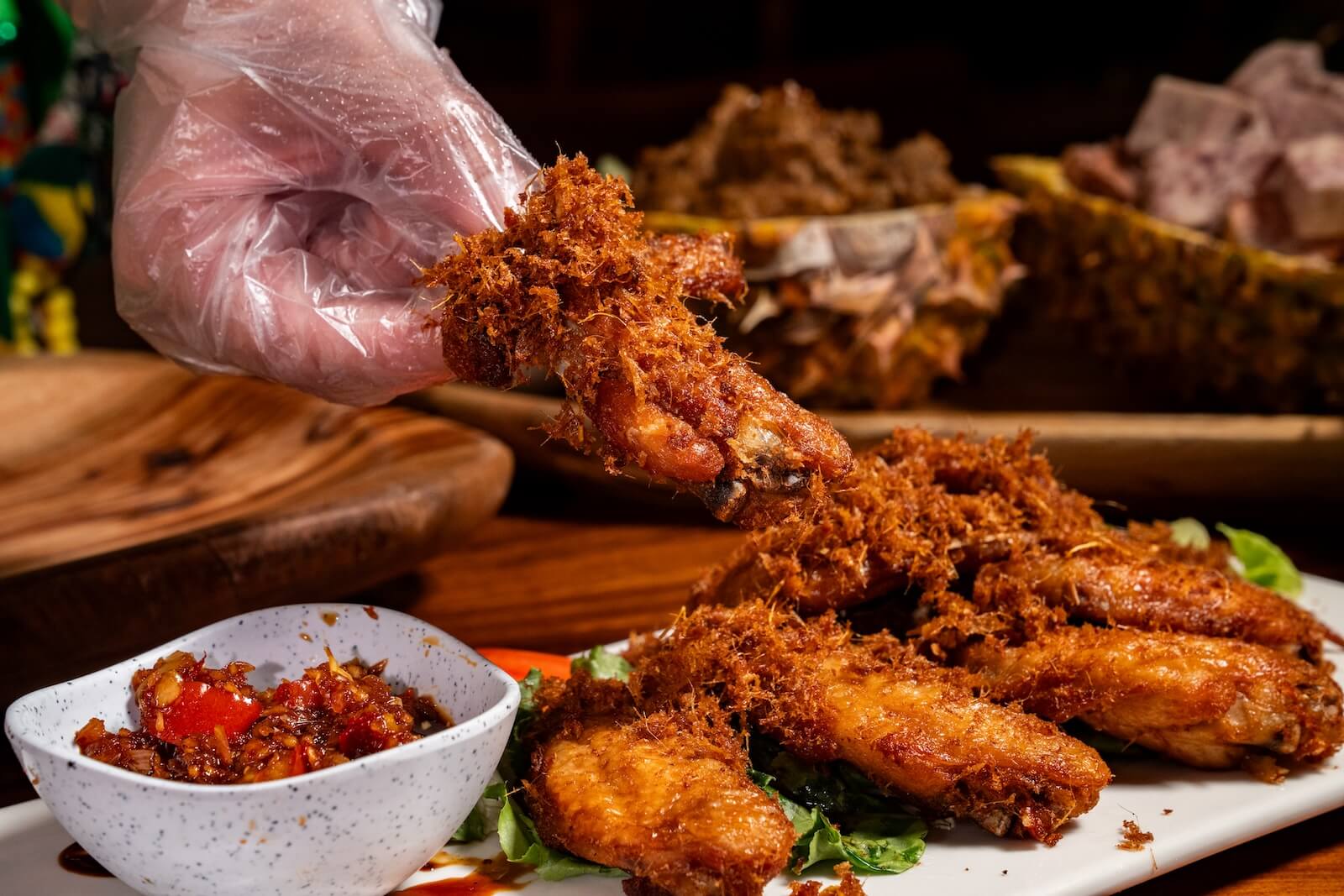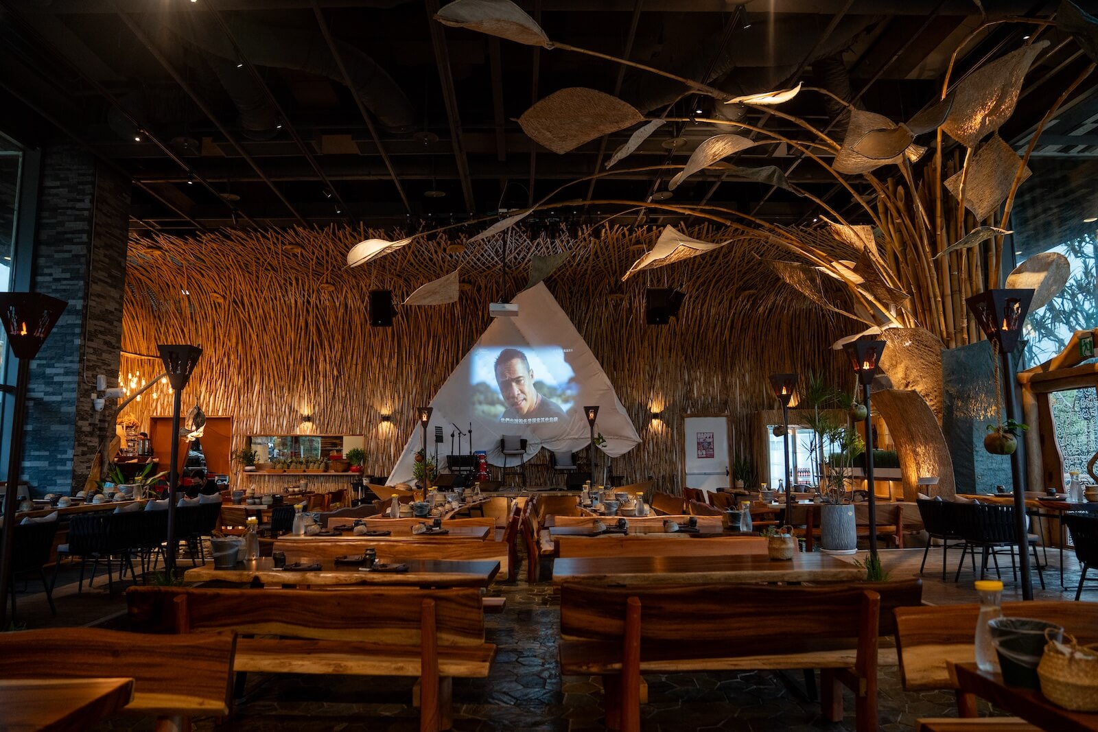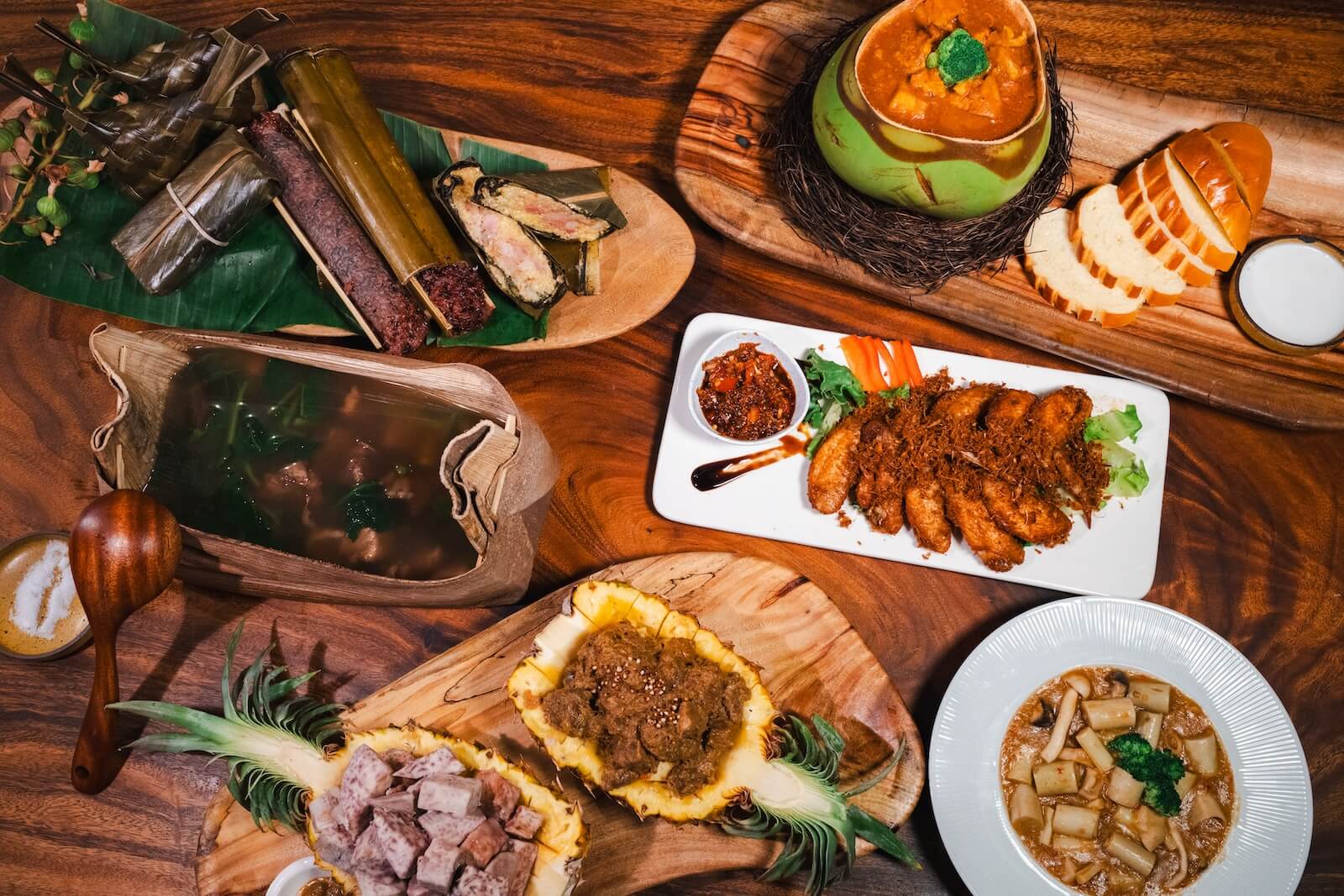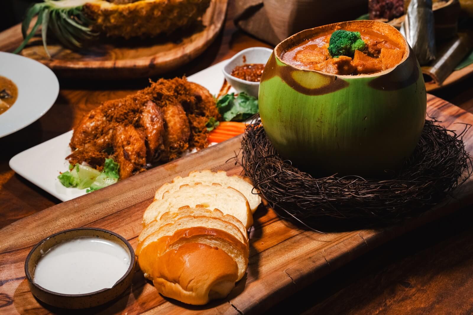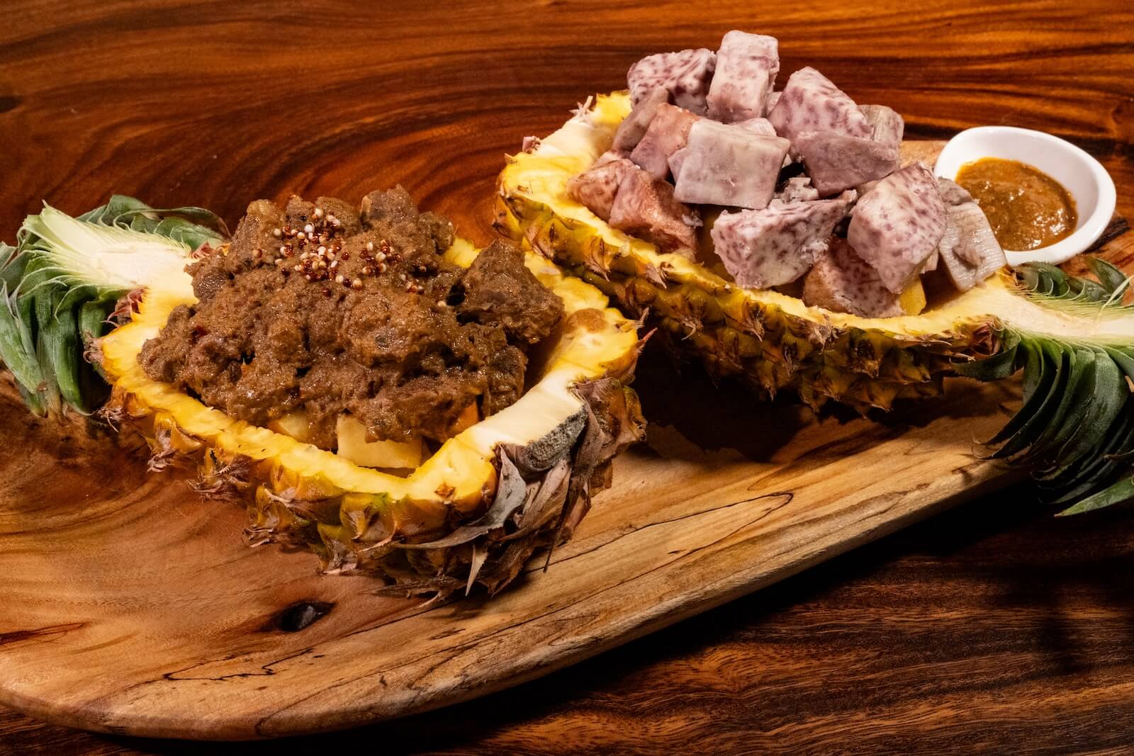 南島風味菜「印尼南薑刺蔥雞」,取翅小節與二節翅,以南薑、薑黃、香菜籽等特殊香料醃製,待雞肉入味再炸至金黃酥脆,搭配產自部落的刺蔥,鹹香中吃得到強烈香氣,蘸上特調酸辣醬汁格外涮嘴;濃郁的「婆羅洲雨林椰子雞」,由馬來西亞「婆羅洲咖哩雞肉」為原型改良而來,咖哩醬使用泰雅馬告、部落辣椒,搭配南洋香料茴香、肉桂等15種以上天然原型香料,燉煮至濃稠狀後倒入椰殼,推薦淋上附贈的椰奶,再搭配特製奶香麵包蘸取食用,香醇滋味盡付唇齒間;「蘇門答臘燉牛肉」取經自印尼蘇門答臘原住民傳統料理「仁當」,數十種草本香料慢燉牛肉至軟爛柔韌,入口辛香微辣,附餐則依循南島族群傳統主食,以切塊芋頭取代常見米飯,並附上手套,讓來客品味芋頭香糯與燉牛肉鹹香的同時,也可體驗當地以手抓食的傳統文化。