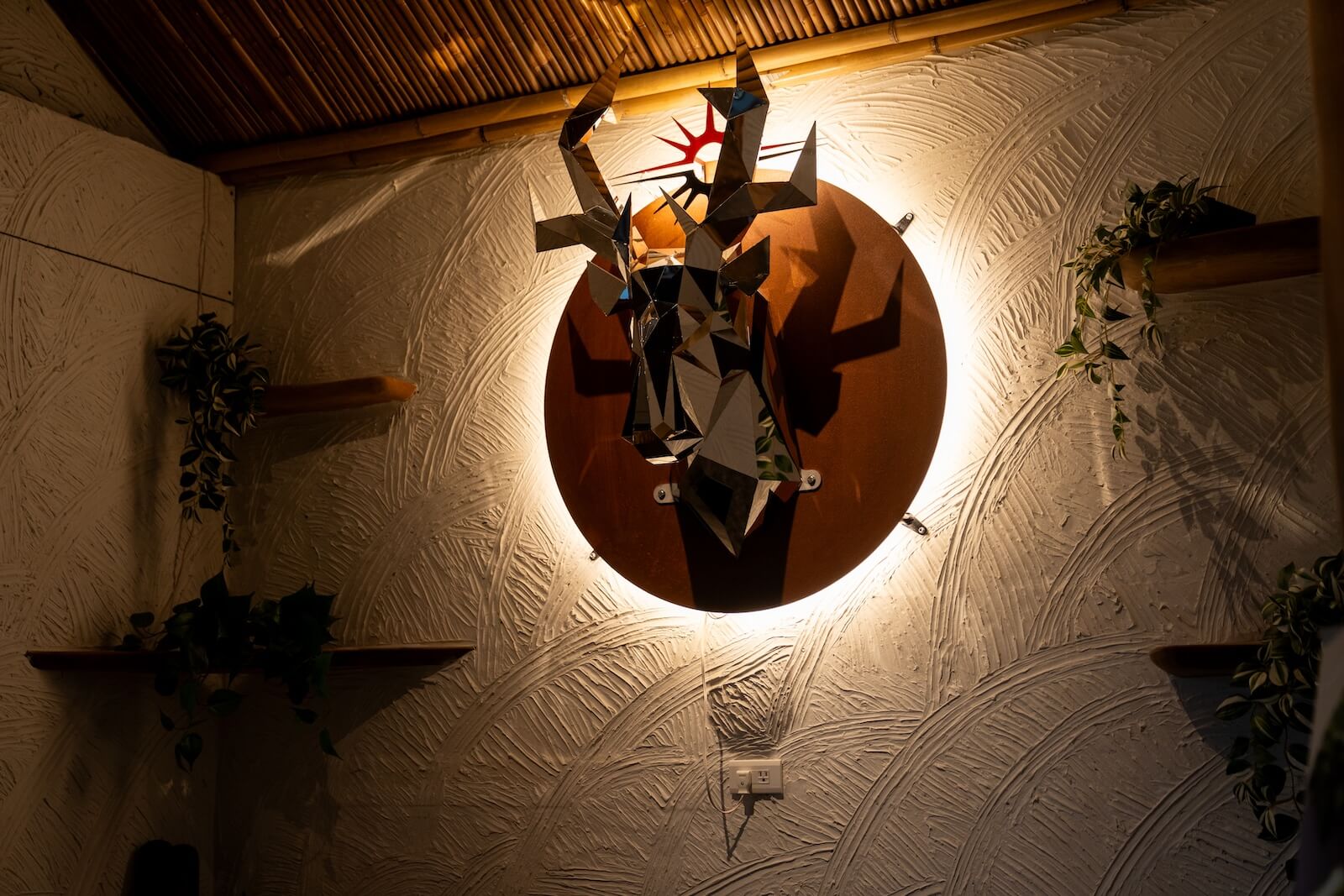 傍晚時分,天色漸漸暗淡,大園青埔大成路的巷弄盡頭處,「鹿馬岸」點亮一盞盞暖黃的燈,微光從內而外鋪開一片柔暖,映照在木雕裝飾上,太陽、月亮、水鹿、藍鯨⋯⋯那些源自口頭傳說的符號被刻畫成圖騰,守護在鹿馬岸的正門,無聲演繹南島族群千年前跨越大海尋找新生地的智慧、勇氣與旅程。
