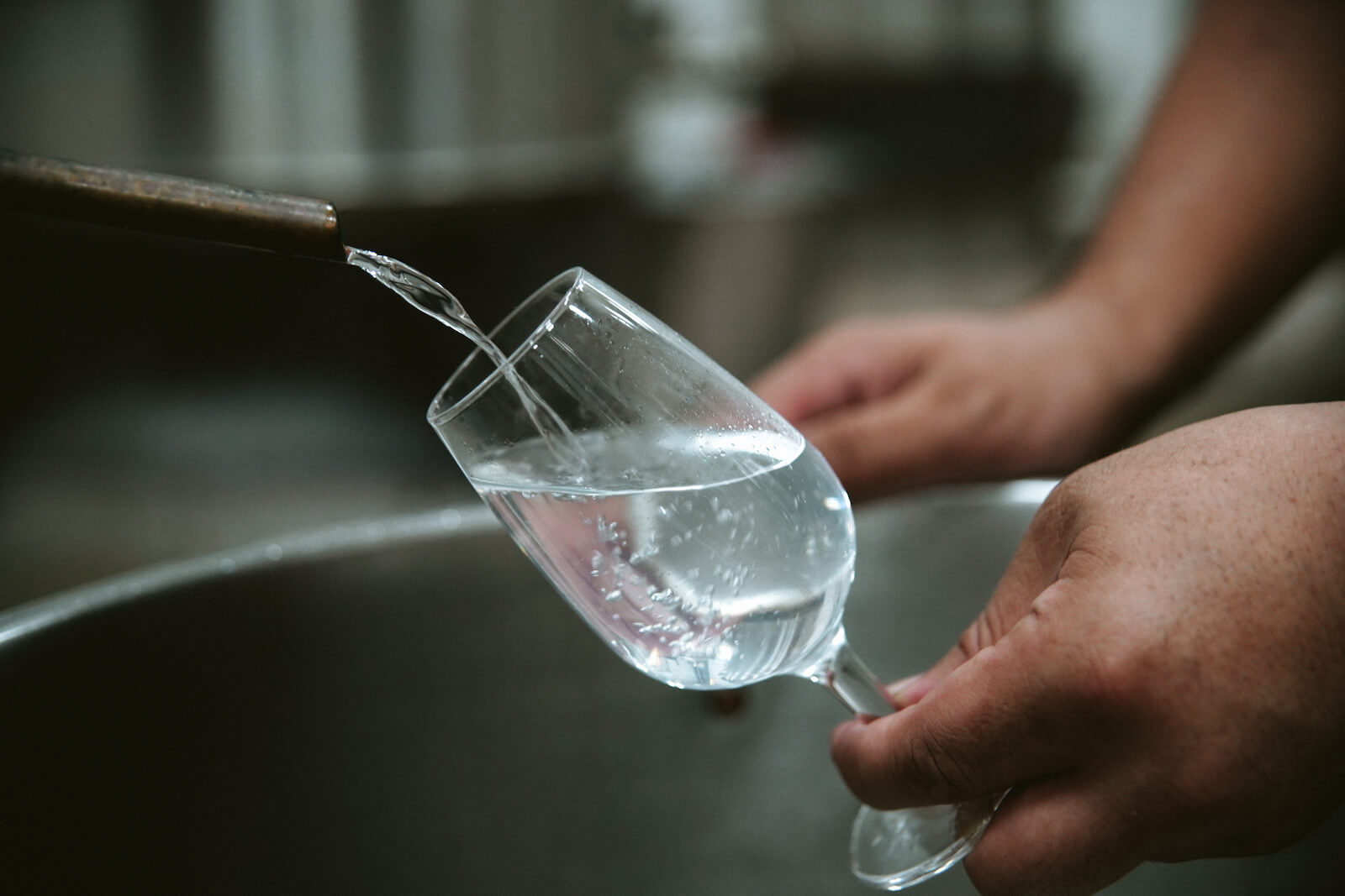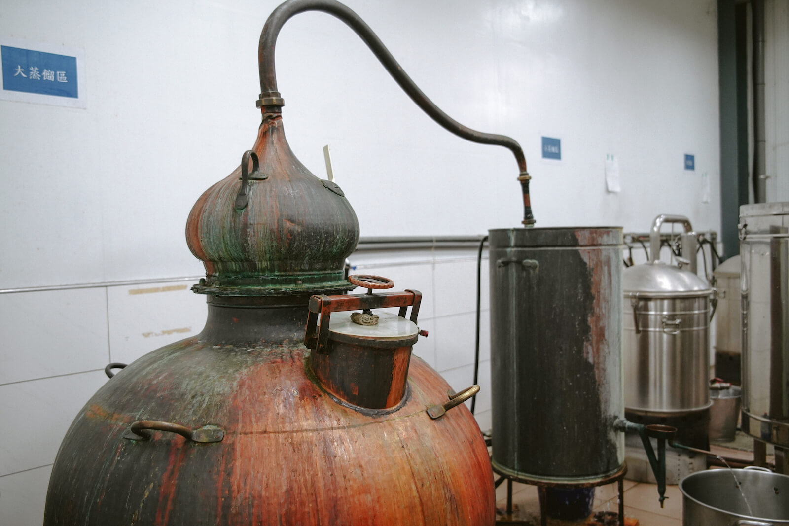 對酒懵懂的他,不清楚什麼樣的質地與香味才是好酒的模樣,但他日日醉心於摸索,熱情地邀請身邊的朋友來品嚐試作品,從回饋中不斷改進製程。從洗滌地瓜開始,再一路到蒸地瓜、下麴、發酵,再到蒸餾;在悶熱的蒸餾區,自葡萄牙引進的600公升銅製蒸餾器正源源不絕地流出澄澈的酒液,酒香在空氣中四散開來。羅己能即使滿身大汗,卻仍神情專注地操作每個細節,彷彿周圍的高溫與蒸氣對他毫無影響。