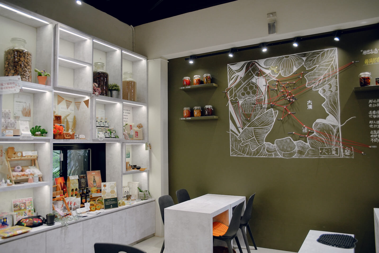 小舖秉持地方創生的精神,推動在地特色物產和文化故事。店內匯聚特色選物,有桃園特色品牌「DB鄧爸麥酒」及大溪野蜂蜜「歸蜜計畫」聯手研發的「溪啤」啤酒系列,結合設計與創意,將在地特色化為商品。團隊也啟動「山海釀」計畫,邀請在地年長的婦女擔任老師,記錄他們醃漬的傳統手藝,大大小小的玻璃罐封存展示在店內各角,珍藏著在地醃漬物乘載的故事與獨家的記憶風味。