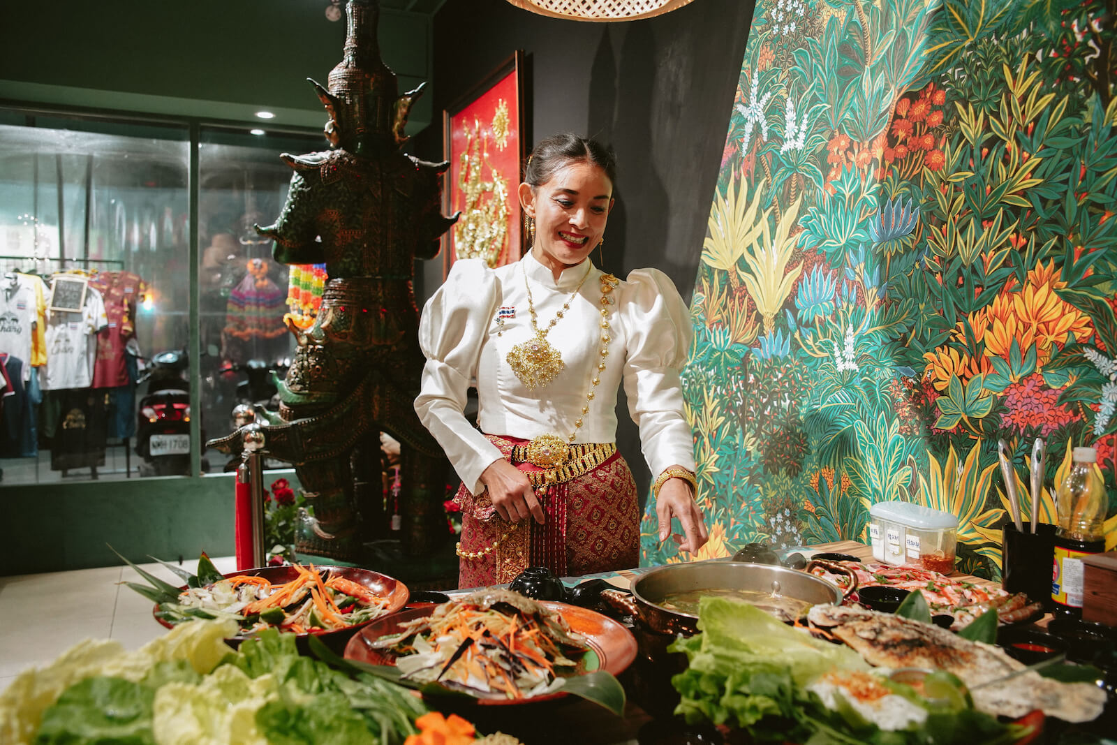 店內品項琳瑯滿目,有台灣人熟悉的泰國菜式如打拋豬、泰式炒飯,也有許多泰國移工思鄉時必點的家鄉味。龔桂香身著泰國傳統服飾,親切地招呼顧客入座,仔細地介紹著一道道鮮香的泰國料理,其中最受歡迎的便屬以多種辛香料熬製而成的「泰國東北特色火鍋」,火鍋湯底使用南薑、香茅、馬蜂橙葉等香料,熬製出富有層次的香醇湯頭,搭配當天市場直送的新鮮豬肝、肉片裹著蛋液下鍋,吃進嘴裡鮮嫩多汁,再將新鮮蔬菜與有機香草一起入口,濃郁卻不失清爽的滋味令人難忘。