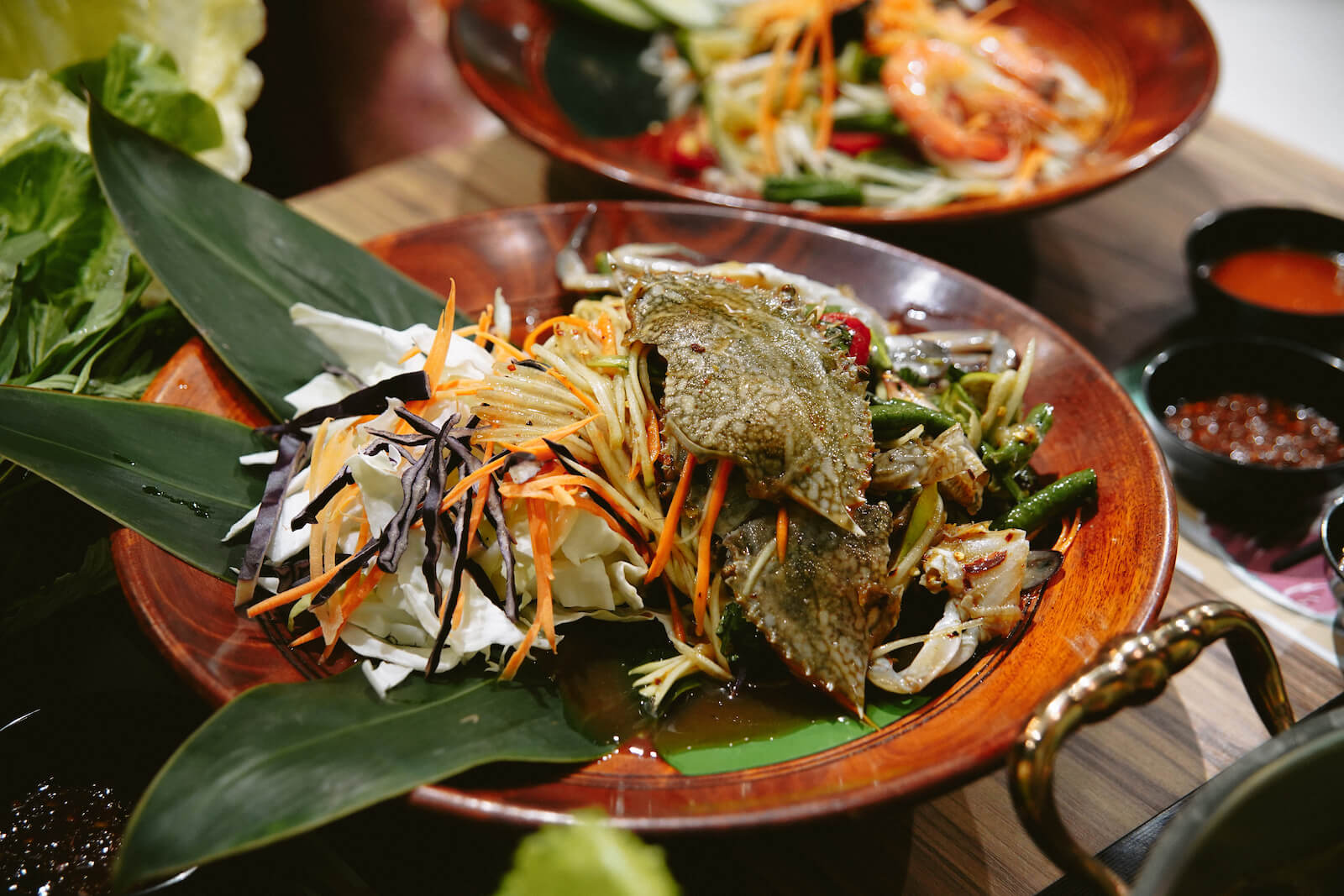 「蔬菜烤魚米線」以自家種植的香茅葉、馬蜂橙葉料理烤魚,替魚肉增添了類似檸檬清香的風味;以手抓食更具風味,將烤魚、香草、米線包入生菜,淋上佐以碎花生調配而成的秘制醬汁,吃來清爽又健康。另一道少見的泰國特色美食「涼拌香料生蟹佐木瓜絲」,新鮮螃蟹以酒、檸檬稍微醃製殺菌,搭配香茅、檸檬葉、木瓜絲涼拌而成,並以魚露提味,呈現香料自然的豐富口味;吃法是大方地抓起蟹腳,吸吮裹滿醬汁、口感如果凍般的生蟹肉,再搭配香辣的木瓜絲一起食用,軟嫩、爽脆的口感交錯,讓品味食物成為一場充滿驚喜的感官體驗。