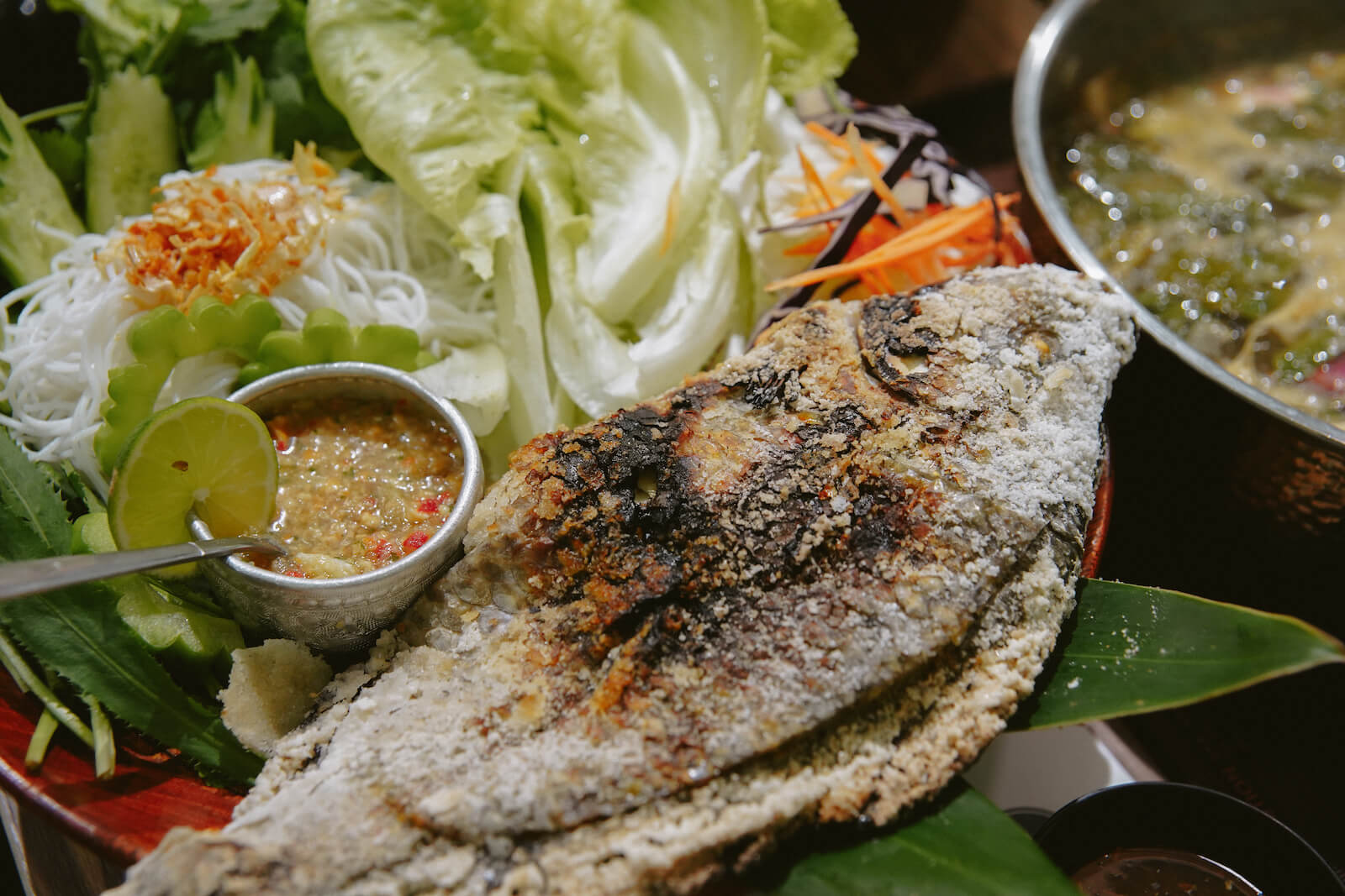 魚肚內塞入香茅葉、馬蜂橙葉,表面撒上大量的鹽烤製,鮮嫩魚肉佐以生菜、米線與特製醬料,是適合多人分享的料理。