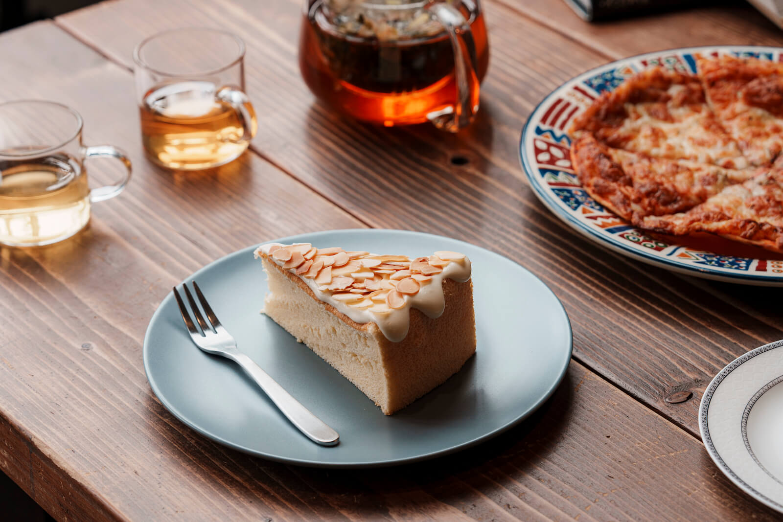 「海鹽奶蓋杏仁蛋糕」糕體濕潤鬆軟,覆蓋以鹽、優格、鮮奶油與乳酪調製成的海鹽奶蓋醬,口感綿密卻清爽,烤杏仁片點綴其上勾勒出豐富口感。「印度香料鍋煮奶茶」香氣迷人,在牛奶與紅茶中,放入與糖混合煸炒出香氣的肉桂、薑黃與綠豆蔻等香料,夏天喝可舒緩進出冷氣房溫差大的不適,冬季喝上一杯則可暖身。余家姊姊思璇說,這項飲品的靈感來自於熱紅酒,為了製作出以香料為主角的天然飲品,一家四口在不同香料間兜轉,幾經嘗試才終於拿捏出適當比例,讓香料的氣味能與茶葉的清香、牛奶的柔潤相融合,又不過分強烈。店裡一位常客,在骨折期間不惜拄著拐杖辛苦爬樓梯,也要點上一壺慢慢品嚐;而對於乳糖不耐的客人,思璇則推薦「養生茶」,以白鶴靈芝、相思藤葉、玫瑰花、羅漢果葉等14種天然花草沖泡而成,清甜淡香最能舒緩身心疲勞。