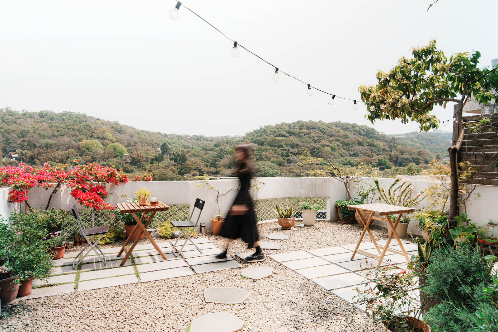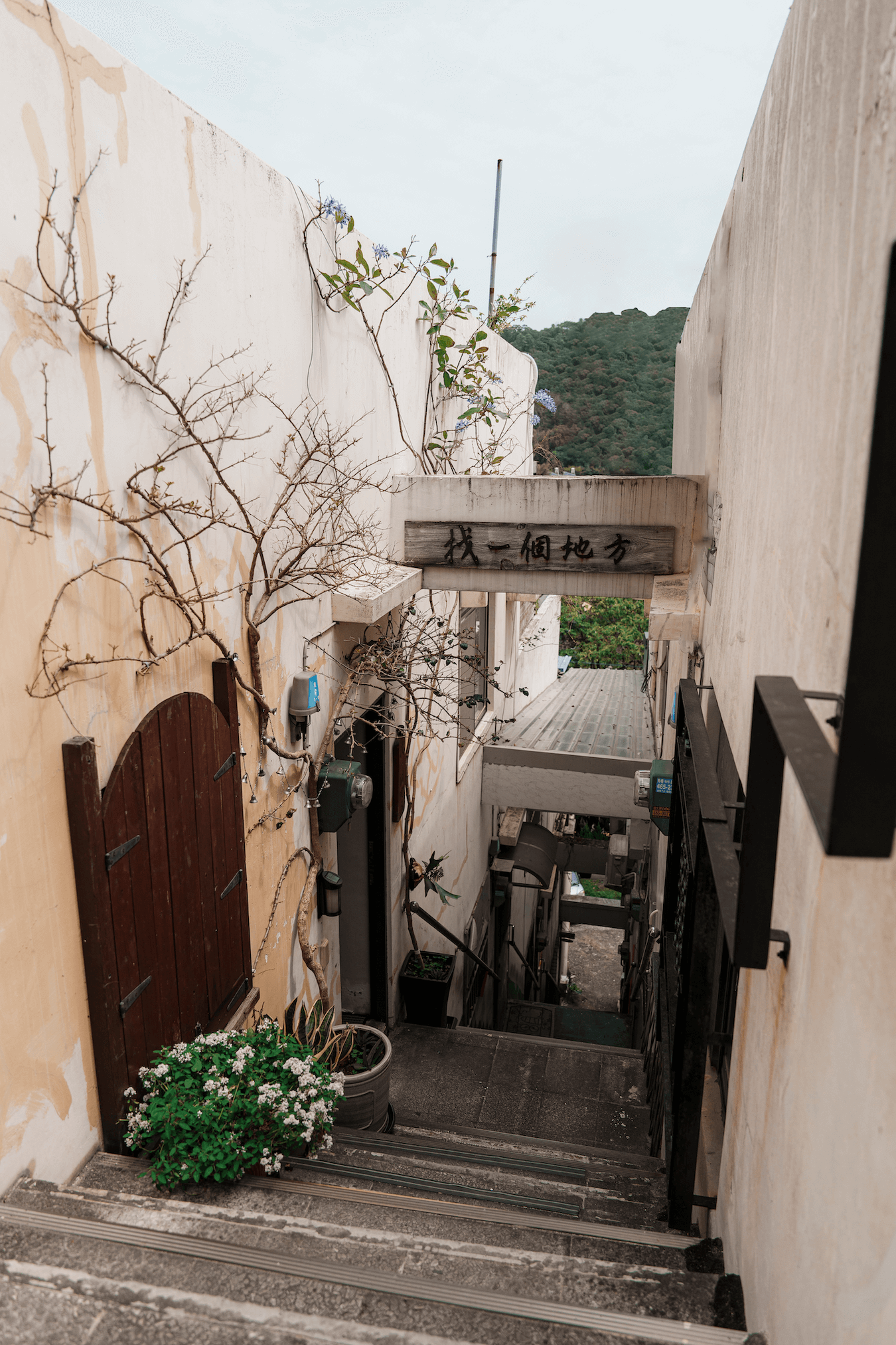 「找一個地方」咖啡廳,坐落楊梅半山腰的社區之中,距離熱鬧市區稍有一小段距離,彎進斜坡後,還需在相鄰的兩棟建築間找到藏身的階梯走下,方可進入清幽靜謐的空間。