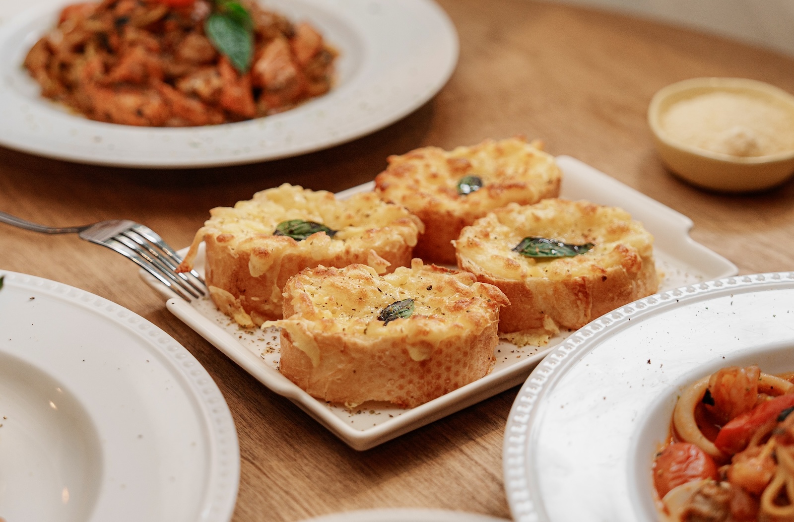 長棍麵包抹上蒜醬及莫札瑞拉起士,烘烤後鹹香濃郁、口感焦脆卻不失嚼勁。