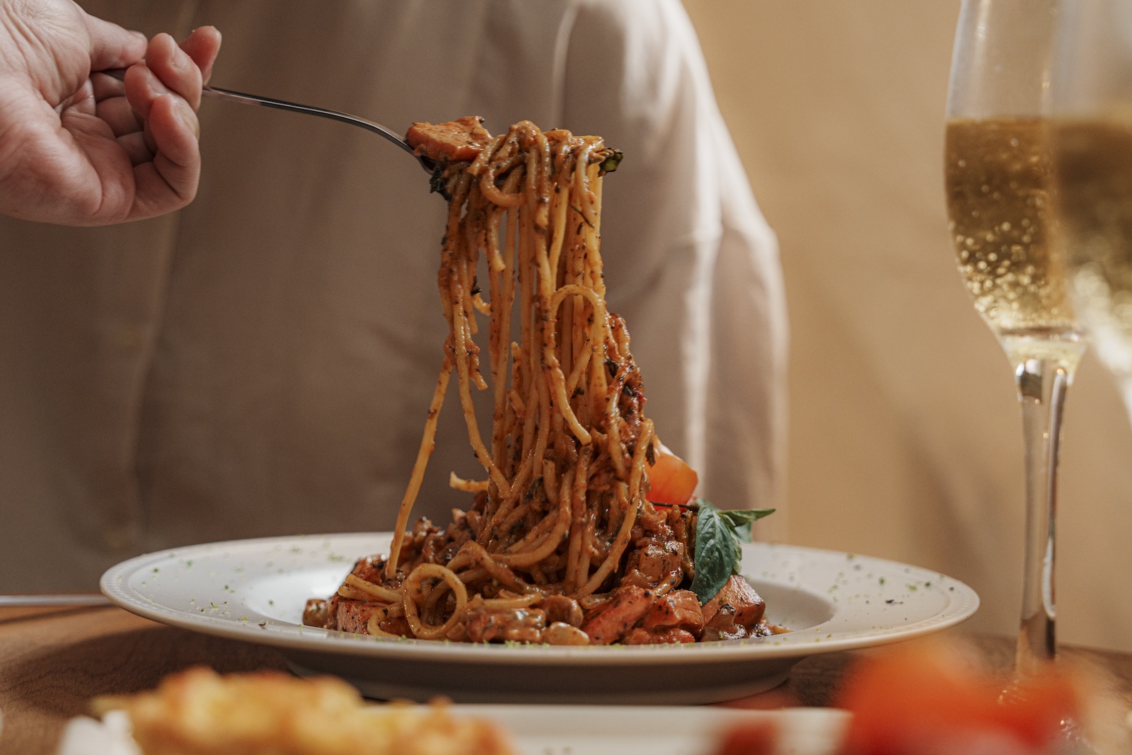 醬汁以清甜的番茄與順滑的奶油為主,將麵體與鮭魚塊包覆,滿滿的松露更添獨特香氣。