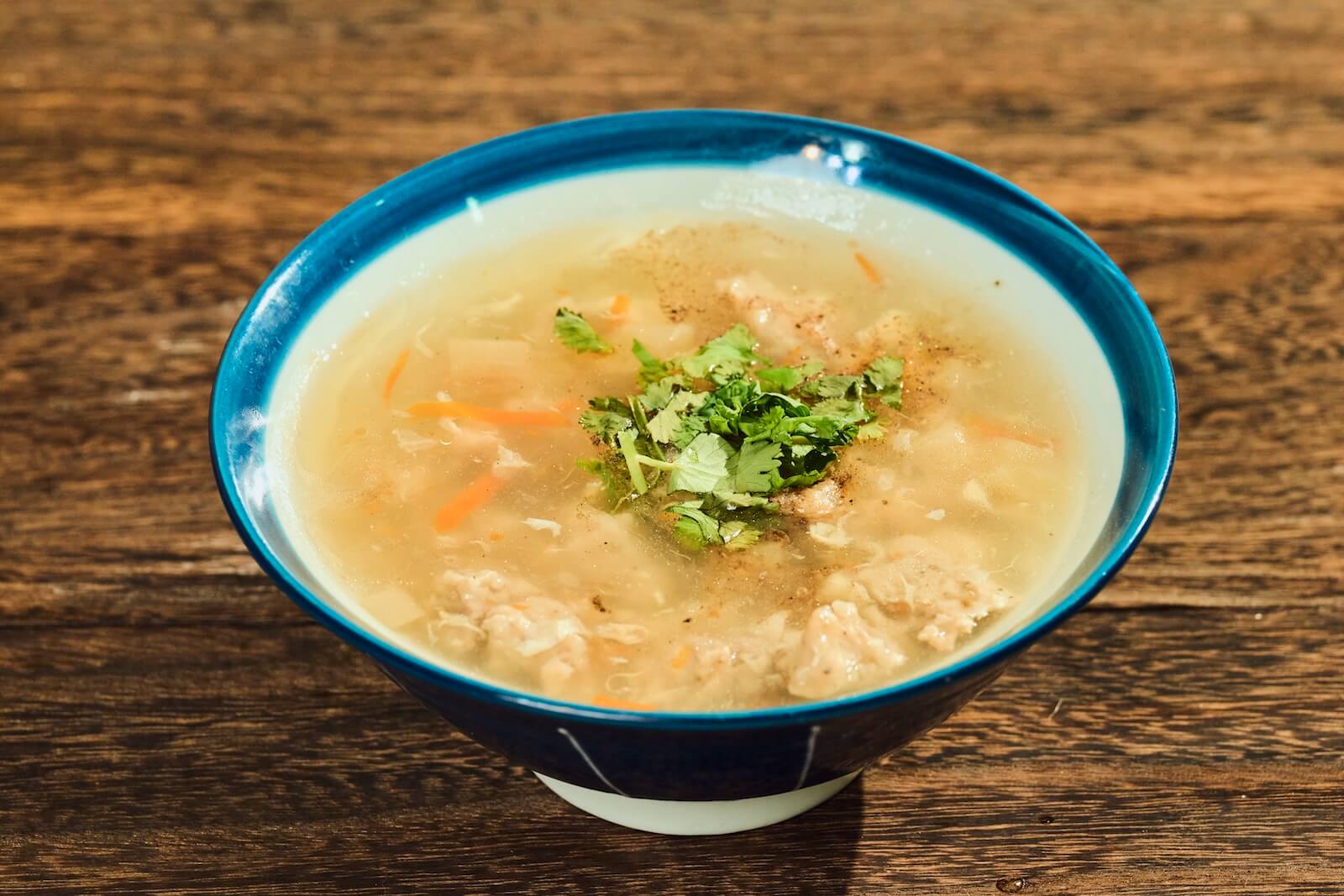「糯米糰好了,接著還得炒肉餡。」第三代林岳蓉細數備料過程,絞肉先以調味料抓醃,再與炒料煸至呈現均勻的金黃焦糖色。除了豬絞肉,油蔥酥、蒜末、胡椒、五香等調料,湯底下鍋的順序亦各有講究;湯頭並非以茼蒿入鍋、淋上香油的做法,而是加入白菜、酸菜、榨菜煮成菜湯,搭配出與眾不同的風味。舀起湯圓放入口中,咬開糯黏軟Q的皮後,迎接味蕾的是肉餡微辛的鹹香,與湯頭酸菜的微酸,一起在口腔漫開。