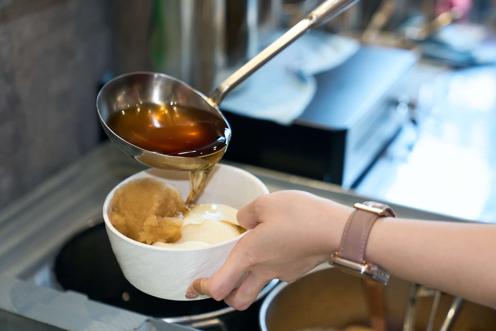 「我們家的豆花,就算加熱也不會散掉喔!」大可分享不同凝固劑作成的豆花,雖各有各的口感及質地,但大多不適合再加熱。豆陣從攤車起步,為了讓客人冬季外帶回家,也可安心加熱享用溫暖甜湯,一一嘗試過鹽滷、石膏到洋菜粉,才摸索出自己的獨特配方,讓豆花在複熱後依然可以保持綿密口感,既不會變硬、變粗糙,也不會因結構破壞而軟爛出水。