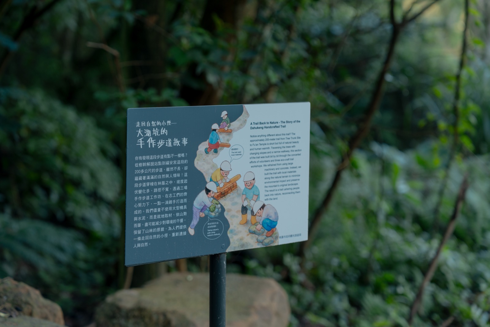 大湖坑步道設計融合了區域的人文歷史與自然特性,沿途藏著許多巧思,解說設施不僅作為方向指引,也呈現大棟山的地景脈絡、昔日煤礦記憶,以及山谷裡的蜻蜓與豆娘生態,其中更有部分步道特別導入「手作步道」工法,由在地民眾就地取材,以石塊及木材鋪設而成,保留了土壤的呼吸與山林的原始肌理,也讓人與大自然重新連結。而特色設施「木材觸感展示區」能親手觸摸不同樹種的質地,將自然教育轉化為指尖的真實觸動。