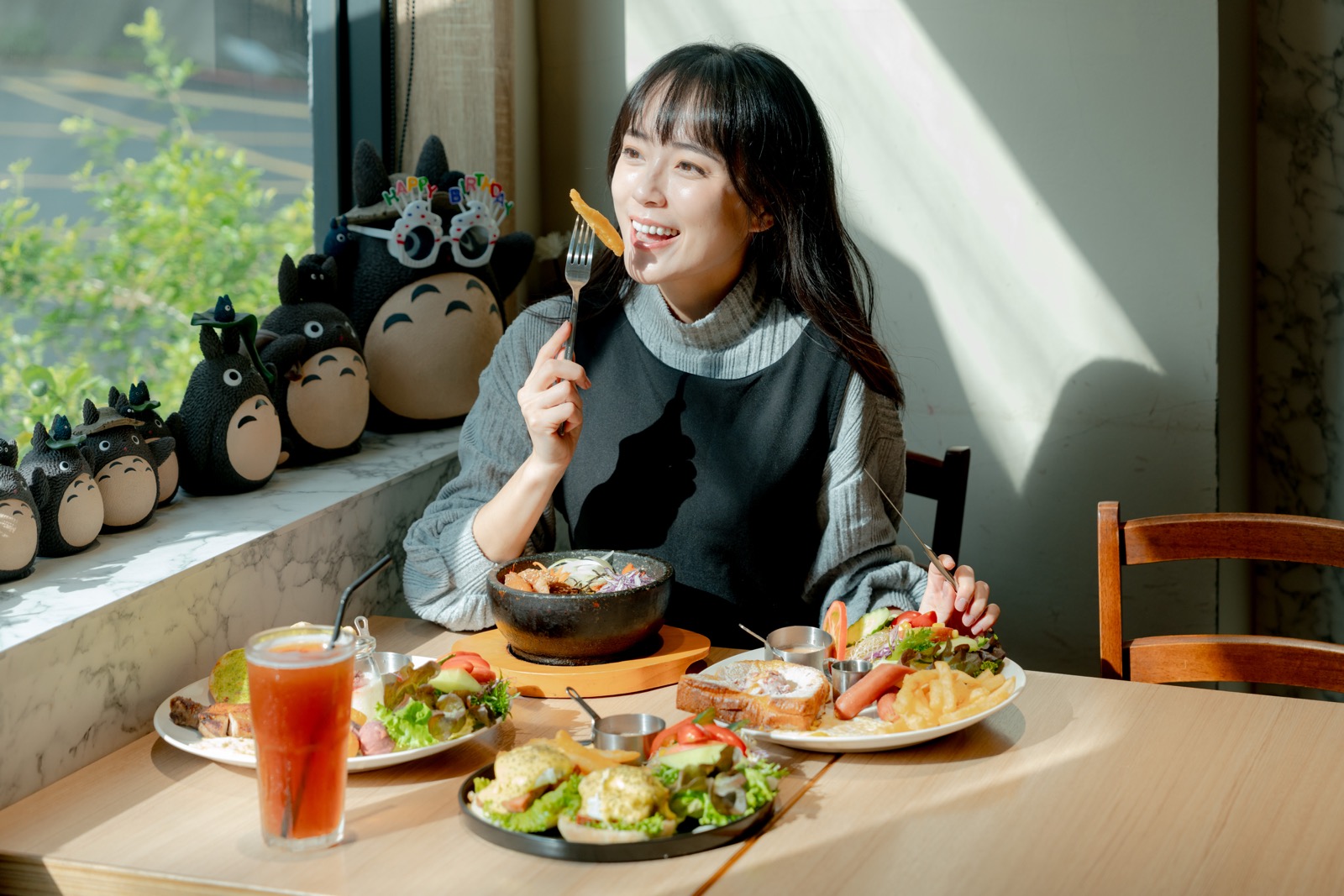暢行步道後,轉往八德永福西街街角的輕食點Caf'e。寬敞明亮的空間,日光自大面落地窗灑落,店內木質調性為主的裝潢與綠意植栽交融,令人感到悠閒愜意。