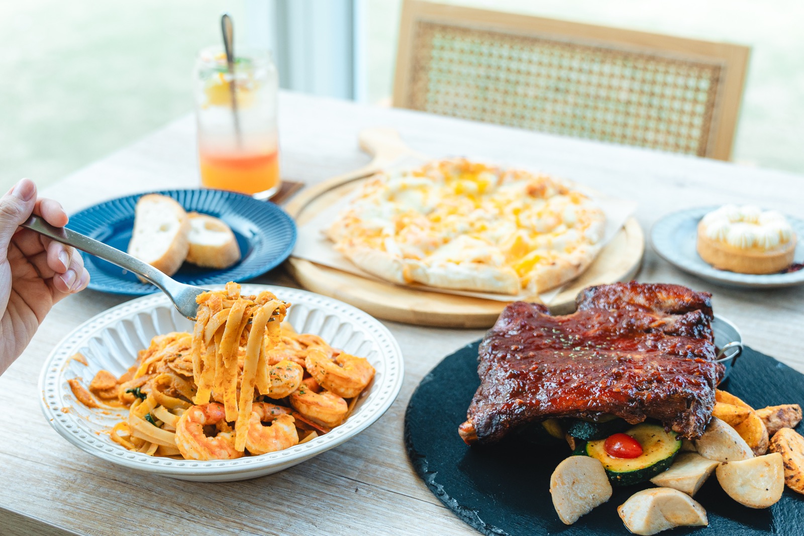 店內料理以義式餐點為主軸,招牌「主廚特製炭烤豬肋排」選用台灣黑豬肉,先以舒肥手法精準控溫,確保熟度均勻再進行烘烤,肉質柔嫩、風味濃郁;「主廚手工熬煮濃蝦醬寬扁麵」則由主廚手工熬煮醬汁,製程雖耗工費時,卻飽含層次濃郁的海味;「西西里海鮮披薩」以薄餅皮見長,口感輕盈,適合多人分食,是不少客人必點的品項。