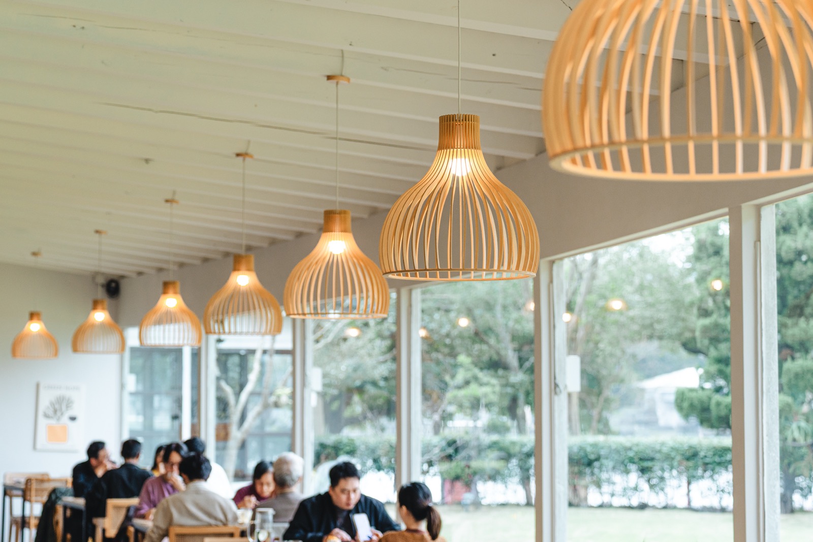 飽覽濕地風光後,來到龍潭大池旁的「The畔 cafe&dining」,純白歐式的木造平房格外引人注目,建築一側大面積的落地窗迎進滿室日光,伴著綠地與池景,模糊了室內外的邊界,散發春日的愜意慵懶。