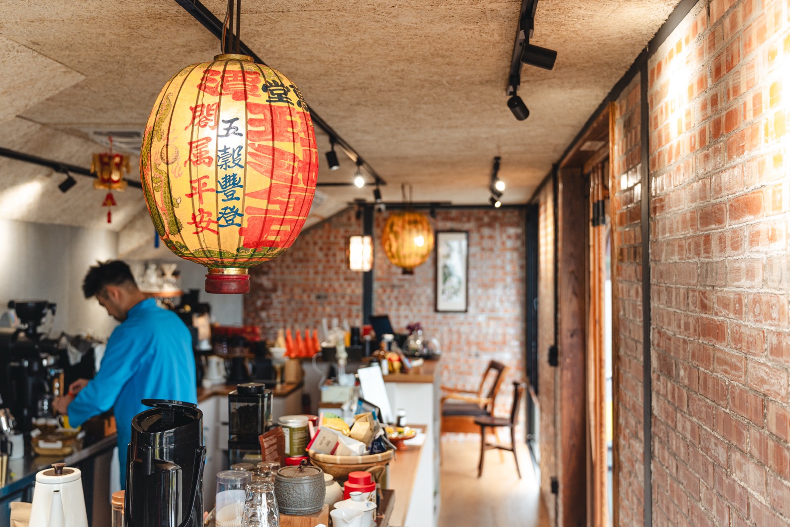 走進店內,極具巧思的中式傳統建築格外矚目。以乾稻草屋頂呼應祖廟開基的草茅意象,牆面選用龍潭傳統紅磚,重現土地記憶。店中的每一處細節皆有法度,從門拱設計到台階尺寸,皆取法《易經》與魯班尺的吉位打造,融入天圓地方、厚德載物的哲理。而牆上畫作及燈飾以梅蘭竹菊四君子為題,讓人身在其中,便能感受到蘊含文人風骨與吉祥祝福的美學寓意。