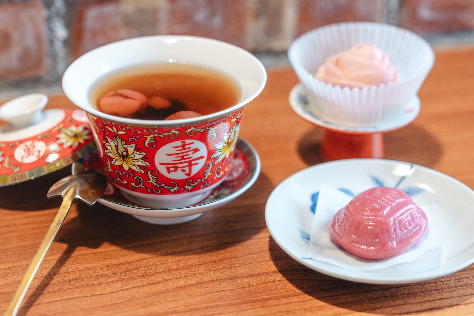 驛庭的茶點也體現傳統文化的延伸。以三才碗斟上一杯龍潭的椪風茶、包種或蜜香紅茶;迷你精緻的「紅龜粿」以火龍果自然染色,遵循古法石壓糯米製成,保留軟糯口感,一如記憶中的滋味;改良蛋黃酥的「百花酥」與古早味「桂花拉糕」,則讓中式糕點透過創新手法,煥發出迷人風味和新意。