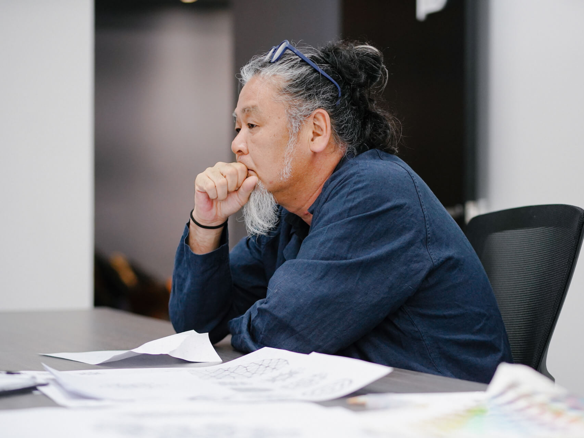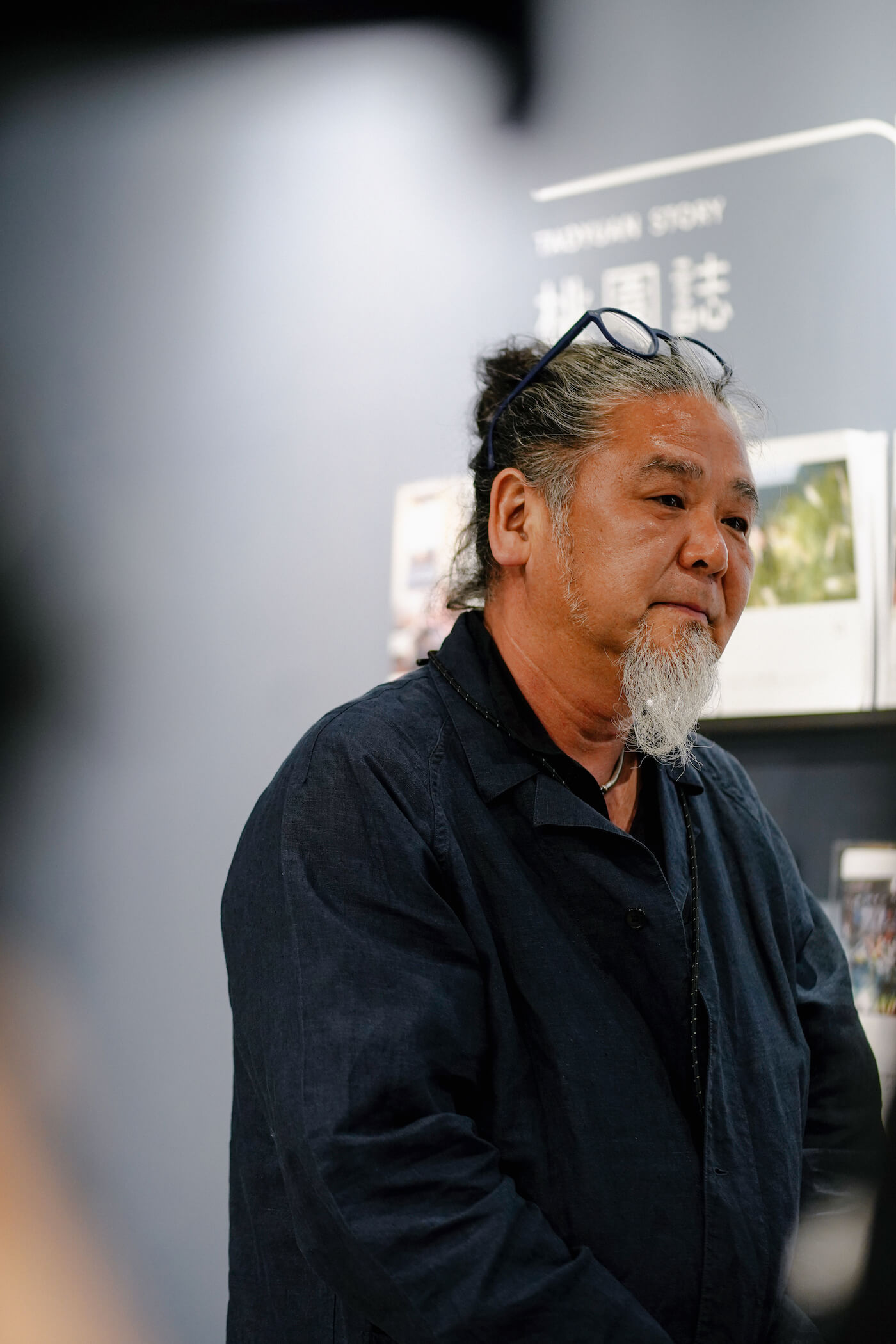 留著不羈的鬍髭,綁起高馬尾,身著日式和服線條的服裝,帶有一股謙遜與克己的禪意,野老朝雄散發著能夠容納所有文化形式的氣場。野老朝雄不是第一次來台灣,卻是第一次深度探索客家文化,他直言:「不熟悉,所以很新鮮。」野老朝雄負責世客博活動主展區世界館主視覺設計,在和策展團隊共同討論客家意象時,野老朝雄連結過往對客家建築及氣味的印象,在他心中逐漸構築出世界館的視覺設計畫面。