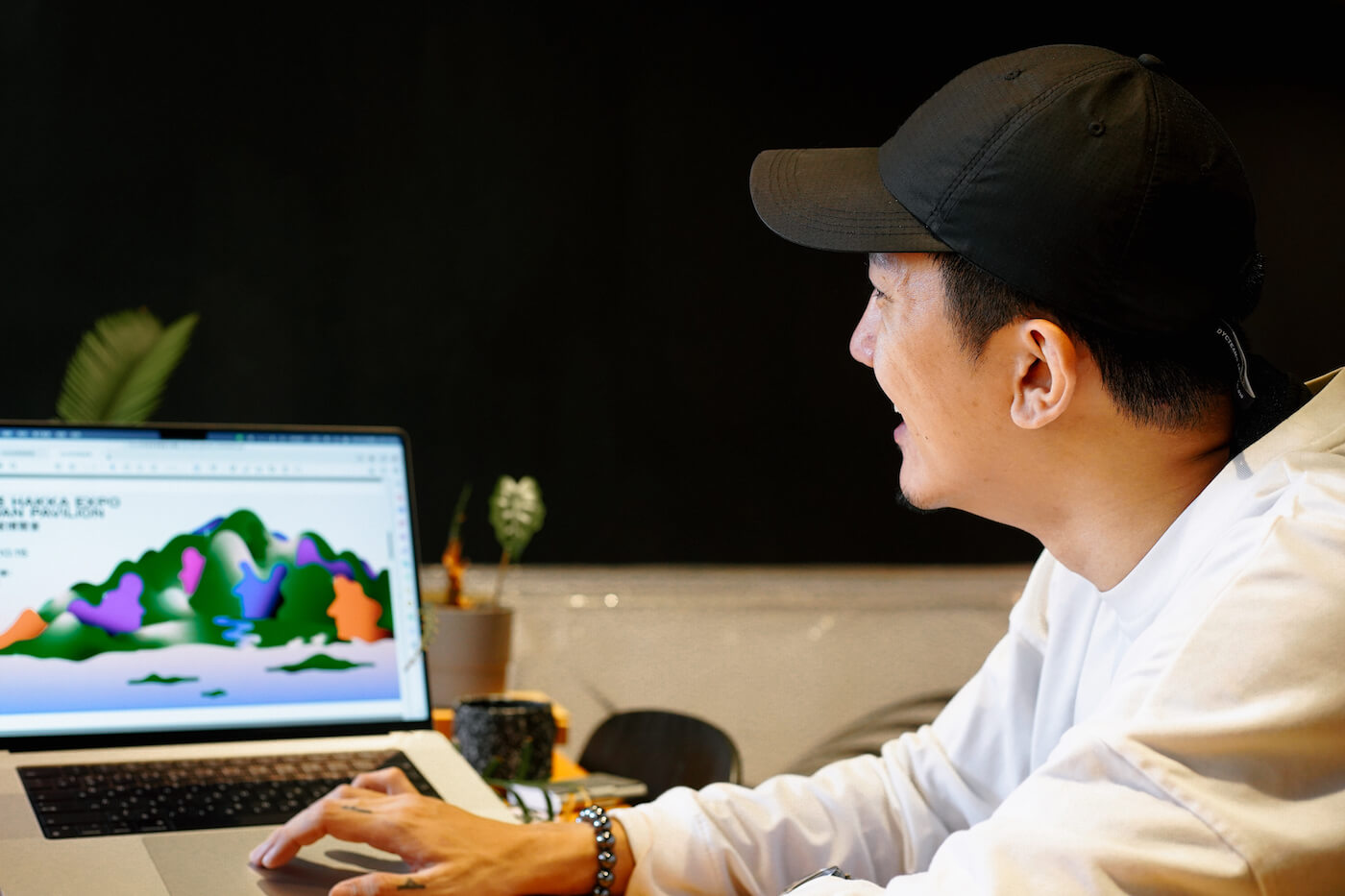 台灣館的主視覺將定調在人像側臉和島嶼的錯位,想表現出所有族群的面孔,居於山中、海邊、平原間,逐步描繪出世界客家博覽會的台灣館模樣。「設計的價値在於『人與人的交流對話』,因為我刻意將正、負空間做成有點相對。」在他的設計哲學裡,他喜歡對話帶來的雙向性,平時甚至會隱沒在人群裡,偷偷觀察旁人對自己作品的反應,「當觀賞者開始詮釋的時候,其實不是我主動去跟他們對話,是他們自己踏入了設計情境,是他們跟我的作品對話,而我也會跟我的作品產生對話。」不禁令人期待,8月開展的博覽會,他又會穿梭在哪個觀展者的對話裡?
