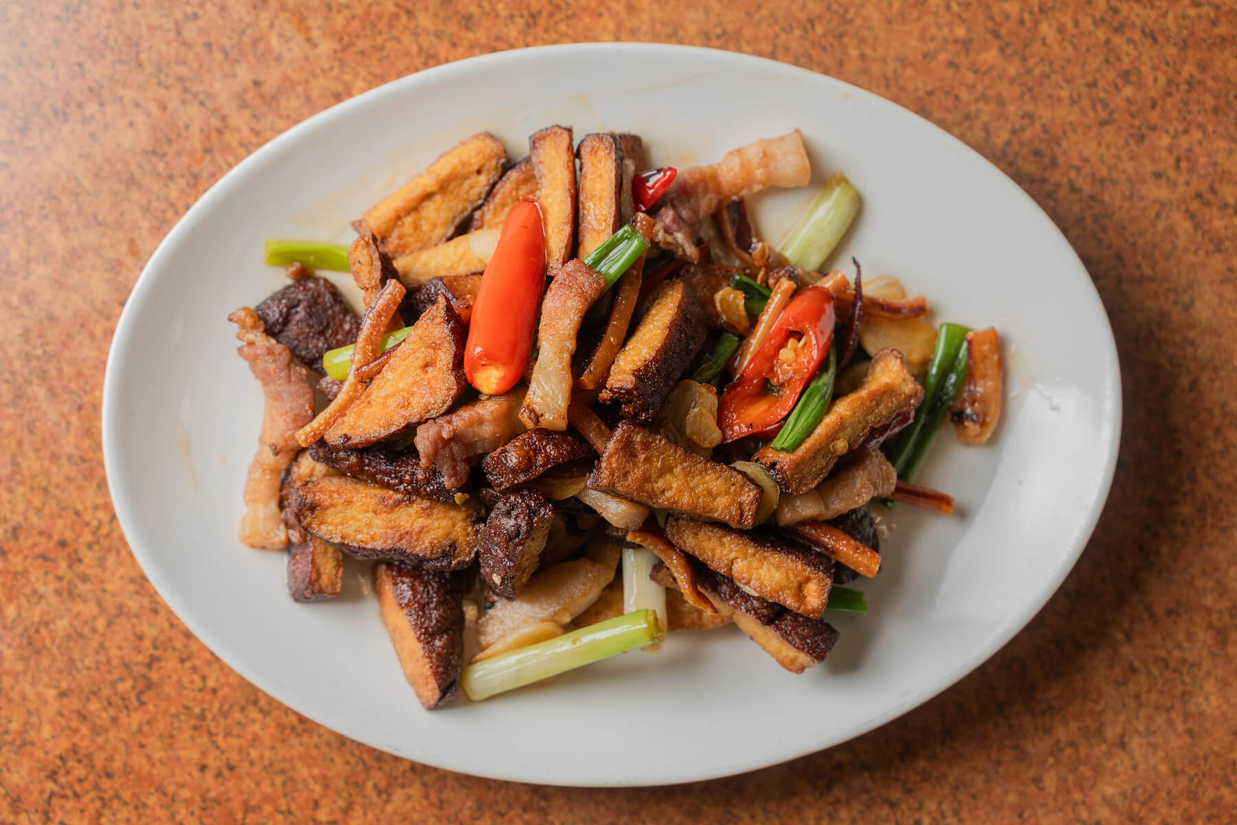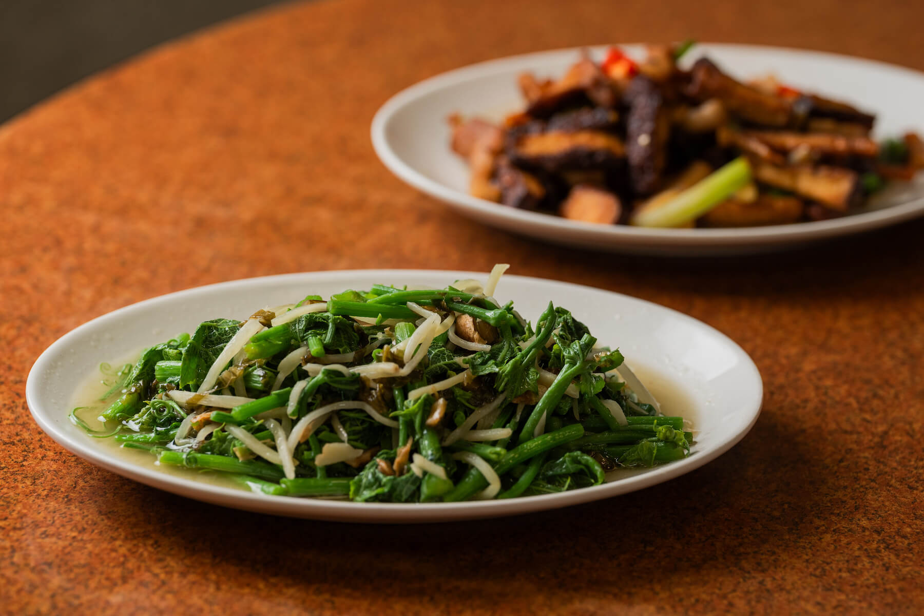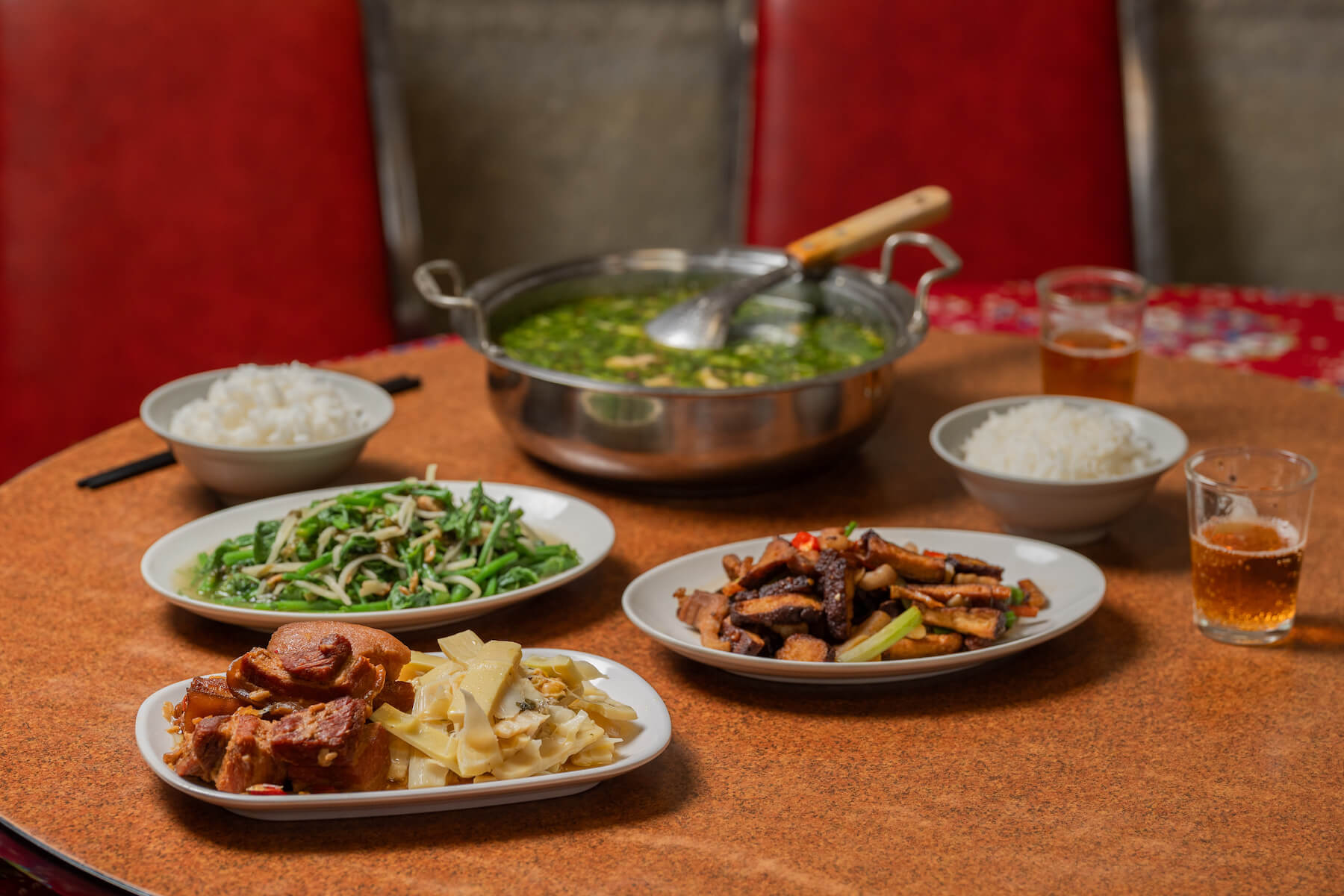 位於新街溪河濱步道附近的「善園客家小館」,沒有豪華氣派的外觀,復古的鋁製玻璃門上印著店名,進入店中,圓桌上鋪著大紅花布桌巾,彷彿看見長輩正傳杯換盞;善園客家小館之所以能飄香在地25個年頭,在於不追求華麗擺盤,而是忠於風味的「本質」與「口感」,以誠意與質樸傳承道地客家滋味。一品焢肉燜筍鹹香油亮,薑絲炒小腸酸韻爽脆,客家白斬土雞的軟嫩入骨,每道菜都是老闆娘灶腳功夫與歲月火候的累積。一桌飯菜,就是客家精神最溫柔的註解——傳統裡透溫度、樸實中見用心。