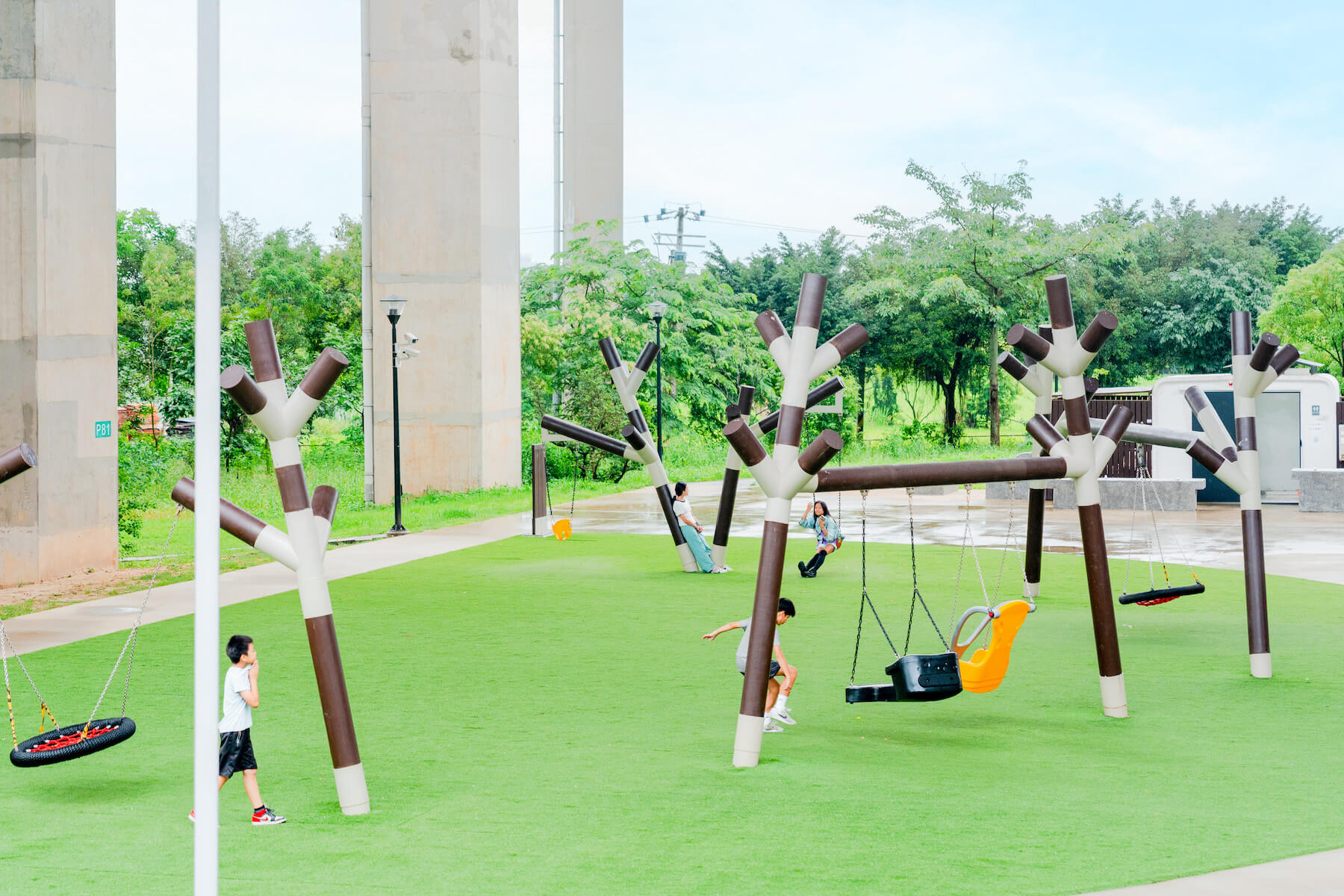 平鎮運動公園就像城鎮中的生活緩衝帶,靜靜藏身橋下,卻能為大人小孩帶來歡樂能量。這座兼具冒險、自然與運動的全齡共融遊樂基地,從設有障礙關卡的挑戰遊戲場、結合地貌特色的地形遊戲場,到富含趣味遊具的擺盪遊戲場、愜意放鬆的自然探索區,以及適合毛孩放風的寵物運動區,搭配健體設施、球場與綠意步道,園區透過分齡分區的設計巧思,滿足不同年齡與族群的遊憩需求,讓玩樂貼近土地的節奏,將家庭共遊的快樂存入記憶釀製。